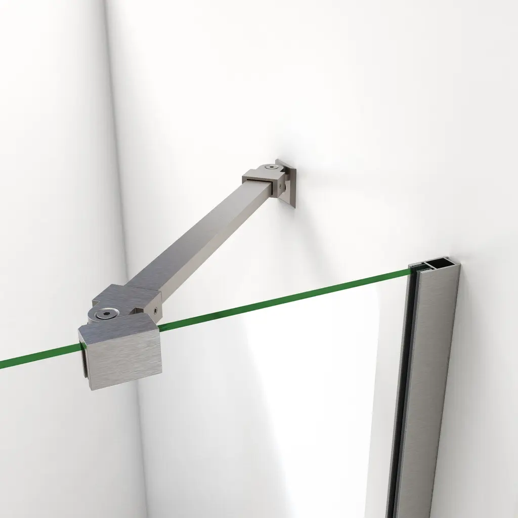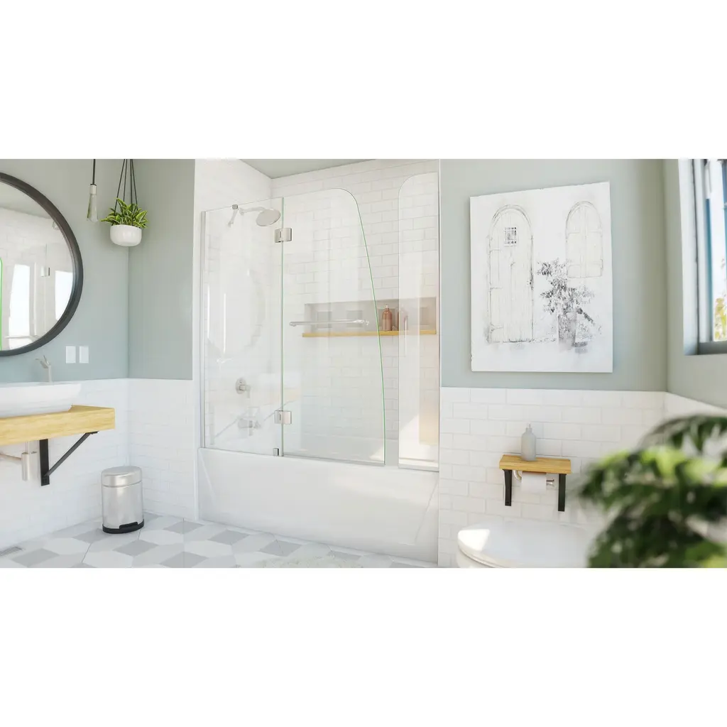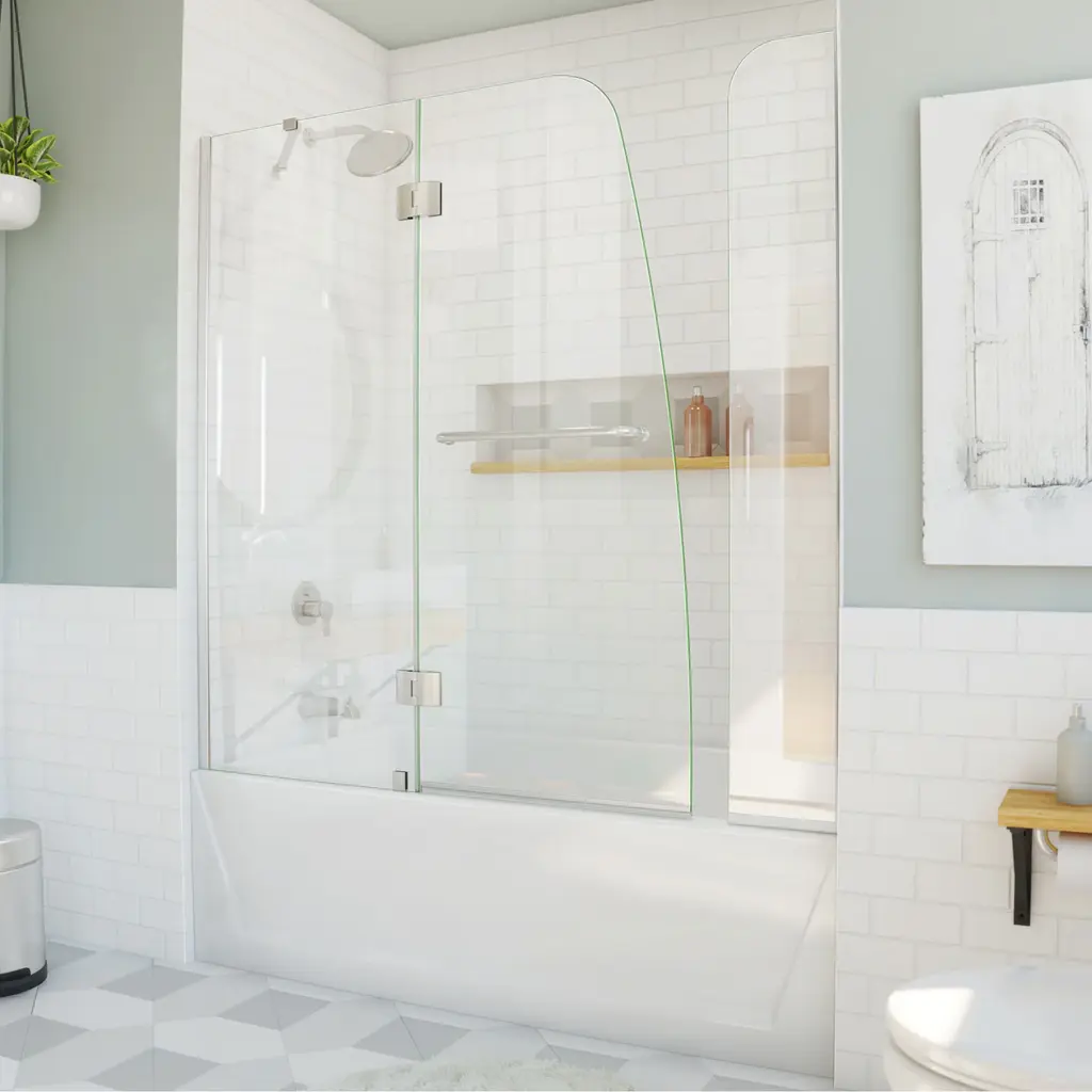 The DreamLine Aqua is frameless shower or tub screen with European appeal and modern architectural design. With a stunning curved silhouette that creates an open, inviting feel, the Aqua will transform your bathroom with elegant style to match its functionality. The Extender Panel provides additional splash coverage. Turn the style in your bathroom space up a notch with the Aqua Tub Door with Extender Panel.Features:Model Size: 56-60 in. W x 58 in. HWalk-In Opening: 27 in. (in a 60 in. opening space)Configuration: Stationary Panel with Swing Door and Extender PanelGreat choice for smaller bathrooms, where a sliding door will not workQuality 1/4 in. (6 mm) thick certified clear tempered glassStationary panel requires a Support Arm for additional stabilityAnodized aluminum wall profile allows up to 3/8 in. adjustment for out-of-plumb (uneven walls)Extender Panel attached to the wall and tub with U-channelsU-channel allows up to 1/2 in. adjustment for width or out-of-plumb (uneven walls)Reversible for right or left wall installation to fit your specific layoutConvenient towel bar handleFrameless curved glass design with a European styleSuitable for installation on any straight (not curved) bathtubProfessional installation recommendedProduct Warranty: Limited lifetime manufacturer warranty