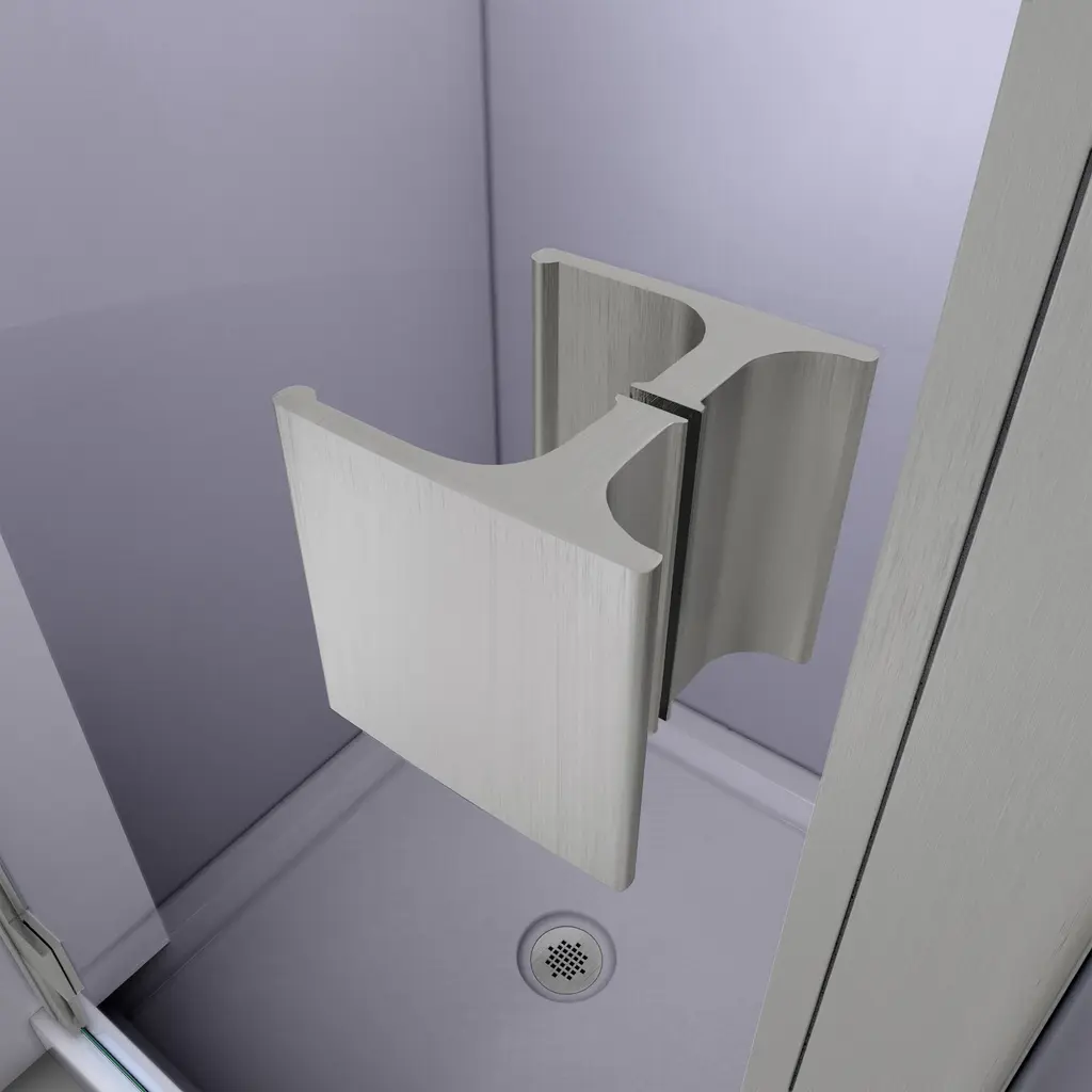 Bring style and functionality to your bathroom with the DreamLine Lumen semi-frameless hinged shower door. The modern wall profile design with integrated hinges (patent pending) and a sleek two-sided handle make this shower door a must-have. The 1/4 in. thick clear tempered glass and full-length magnetic door latch ensure quality and water-tight closure. Choose between a right or left door opening to fit your specific layout. With 1 in. of total adjustment available for width or out-of-plumb, the Lumen shower door will fit your shower space renovation perfectly.Features: