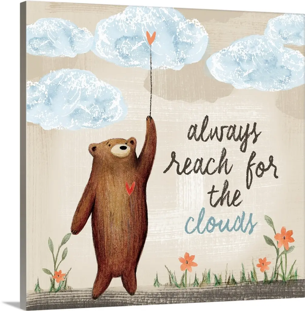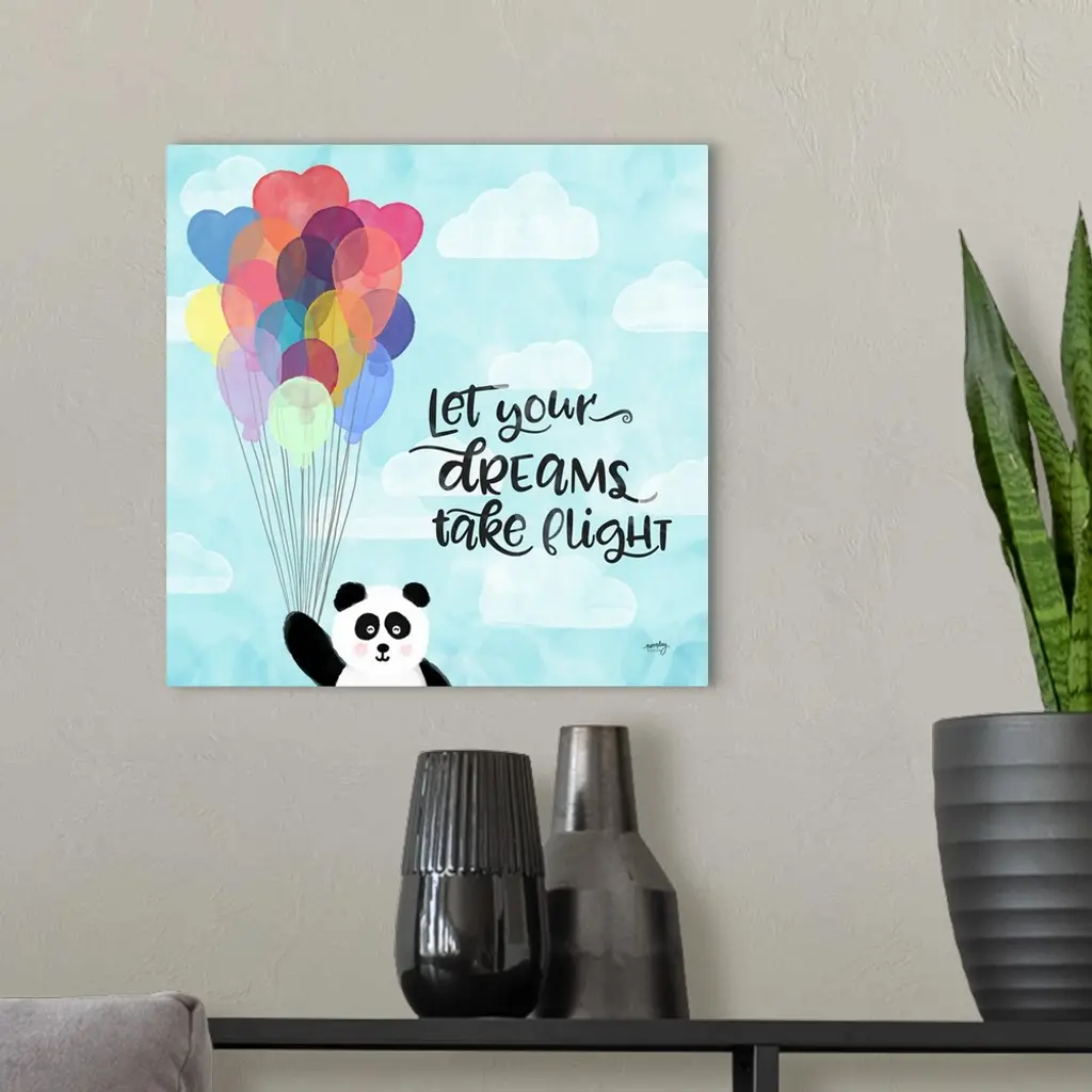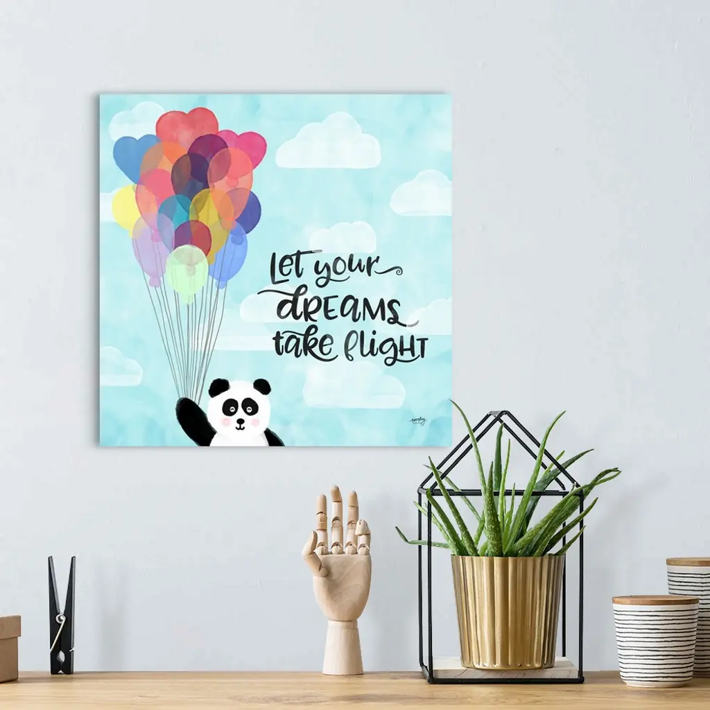 "Let your dreams take flight" with a panda bear holding a large amount of colorful balloons in the sky.