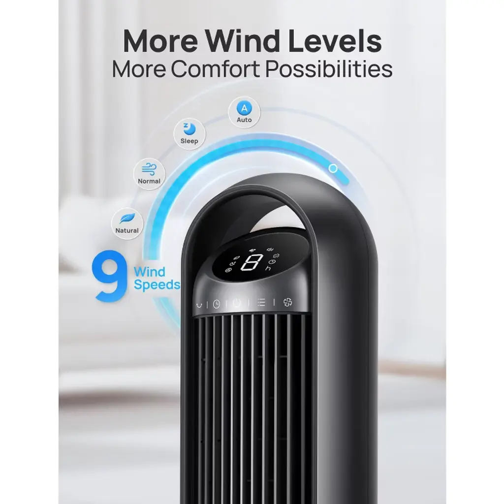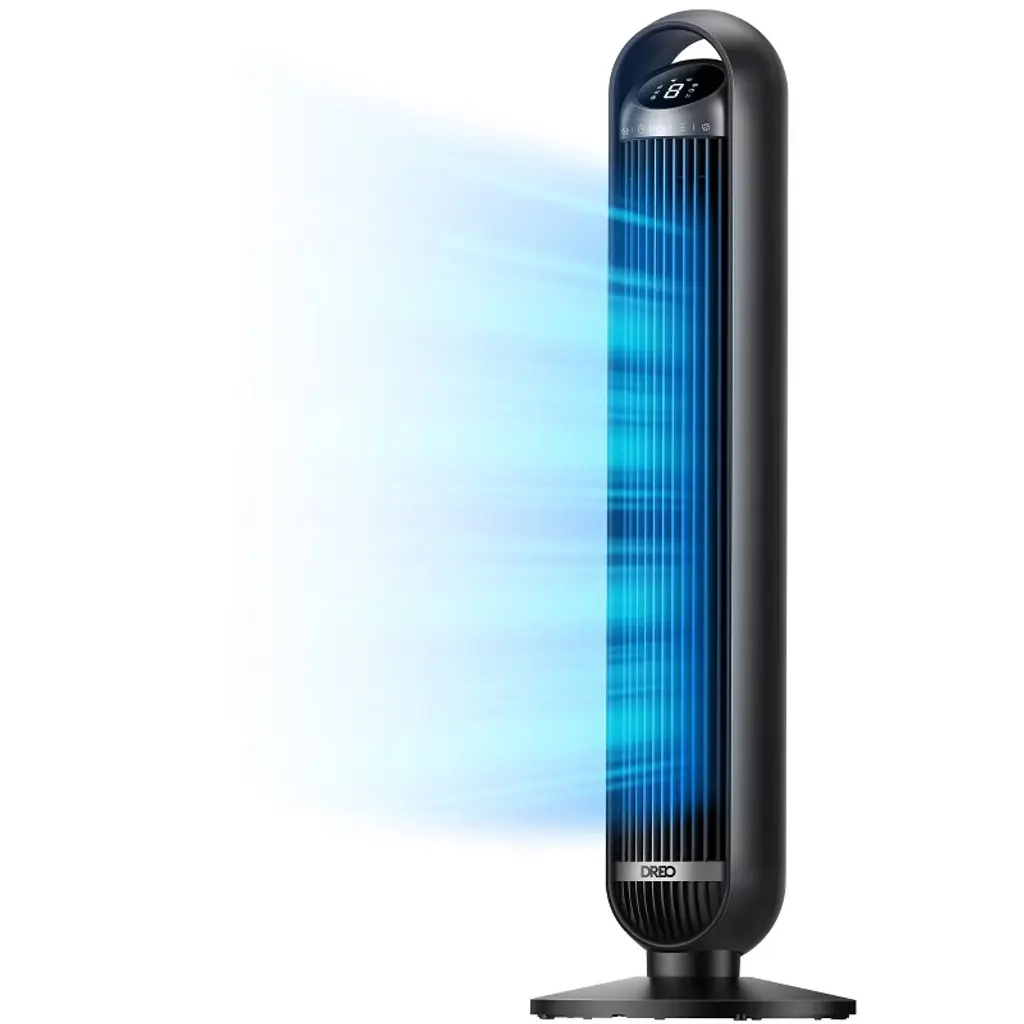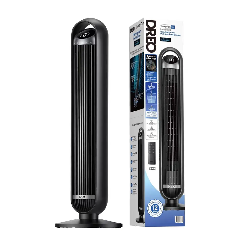 The DREO 36-inch tower fan combines ultra-quiet operation (25dB) with hyperfast winds (up to 27ft/s) for efficient cooling. Featuring 4 modes, 8 speeds, 90˚ oscillation and a 8-hour timer, it offers customizable and easy to clean comfort, while being pairable with air conditioners for energy savings.