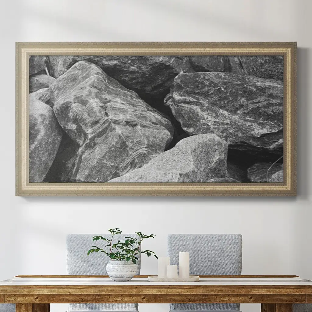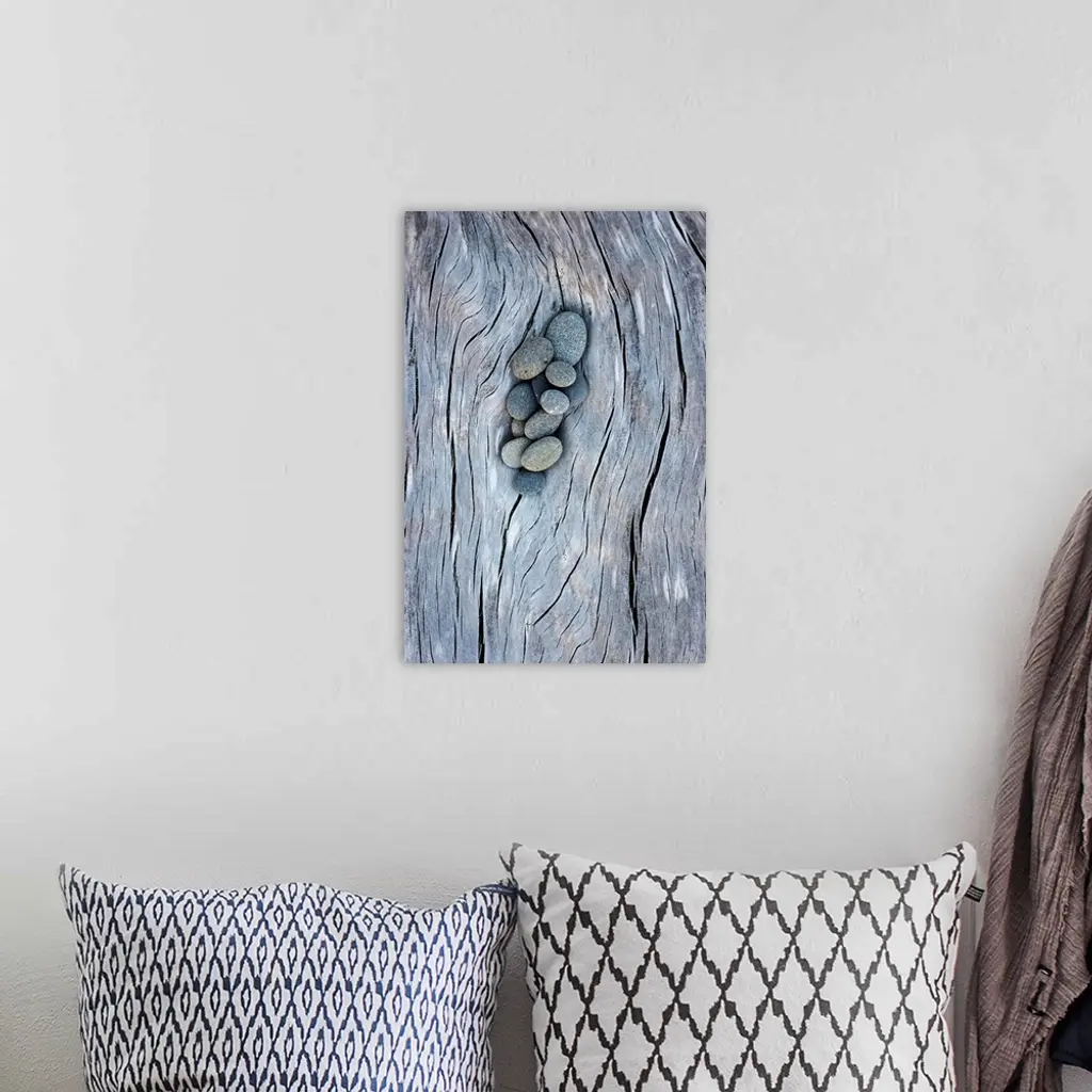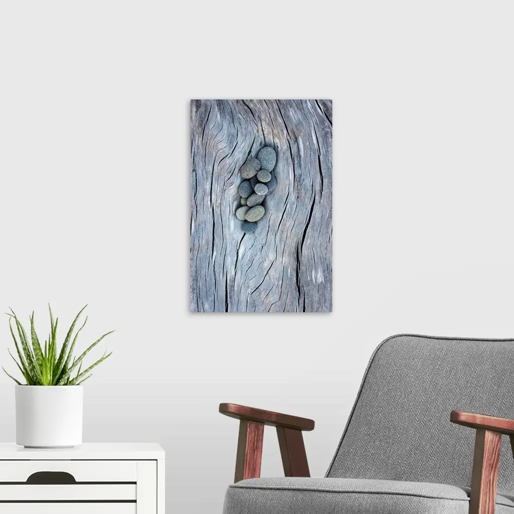 Photograph of smooth rocks piled on top of a piece of driftwood on the pacific northwest coast.