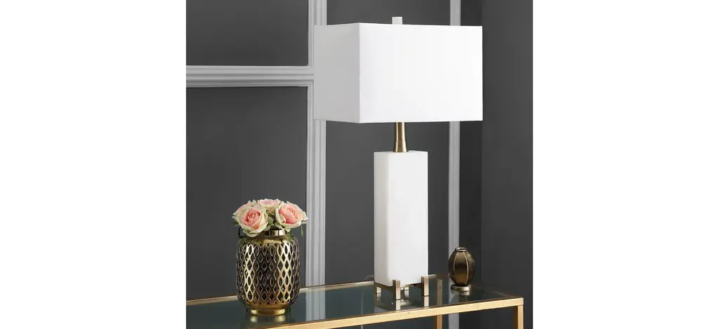 Designed to highlight the elegance and allure of Art Deco glamour, this Drina Alabaster Table Lamp is a symbol of ageless luxury. Exquisitely crafted of white alabaster, it is adorned by brass gold details and topped with an off white cotton shade.