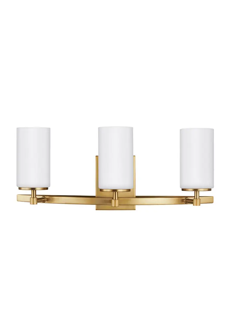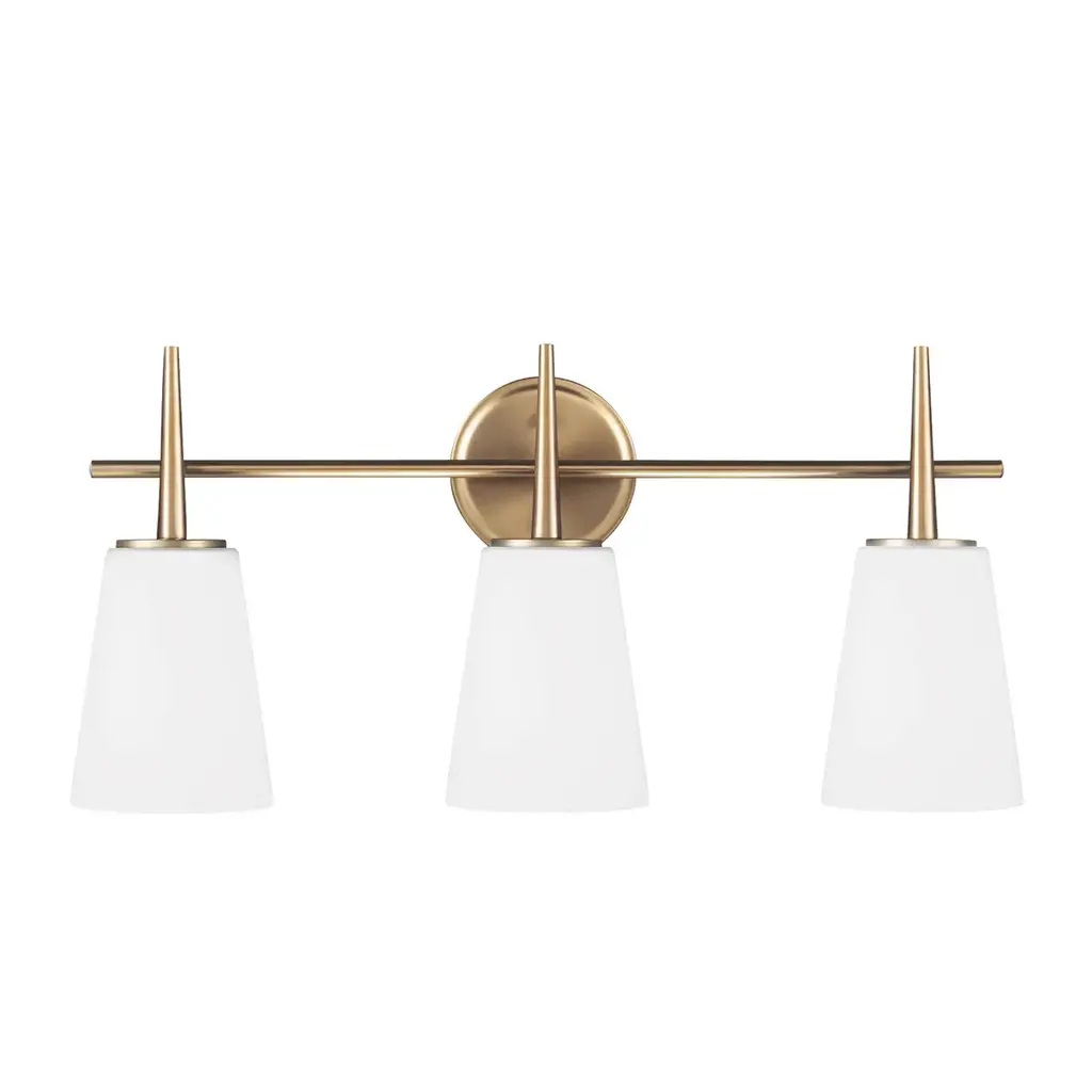 The Generation Lighting Lighting Driscoll three light vanity fixture in satin brass is an ENERGY STAR qualified lighting fixture that uses fluorescent bulbs to save you both time and money. The 1960''s-inspired Driscoll collection by Generation Lighting Lighting features the clean lines of tapered stems and glass shades. Simplicity combined with sophistication creates this strikingly modern look. Offered in a Brushed Nickel finish in addition to the Chrome finish also offered for wall/bath fixtures - all of which feature Etched White glass shades. The assortment includes nine-light, five-light and three-light chandeliers, a mini pendant, as well as one-light, two-light, three-light and four-light wall/bath fixtures. Both incandescent lamping and ENERGY STAR-qualified LED lamping are available; all fixtures are California Title 24 compliant.Lighting Information:Bulb type: 3 A19 Medium 9.3 watt light bulbsNumber of bulbs: 3Bulb(s) includedETL Listed