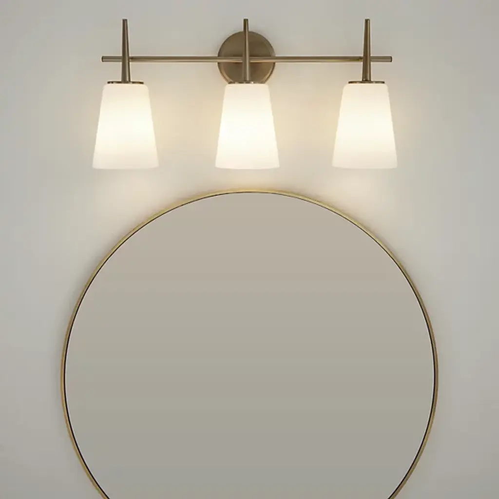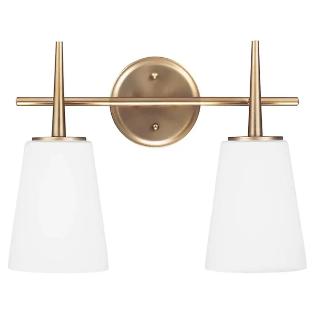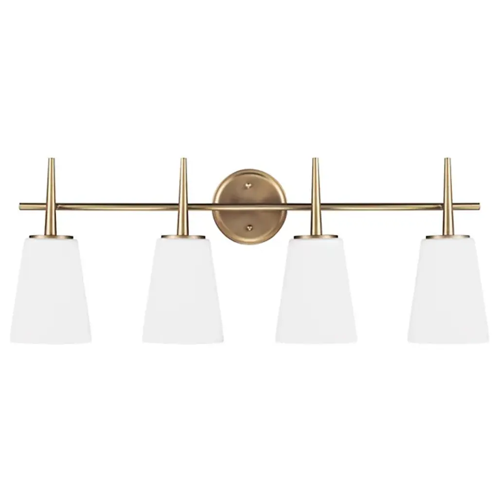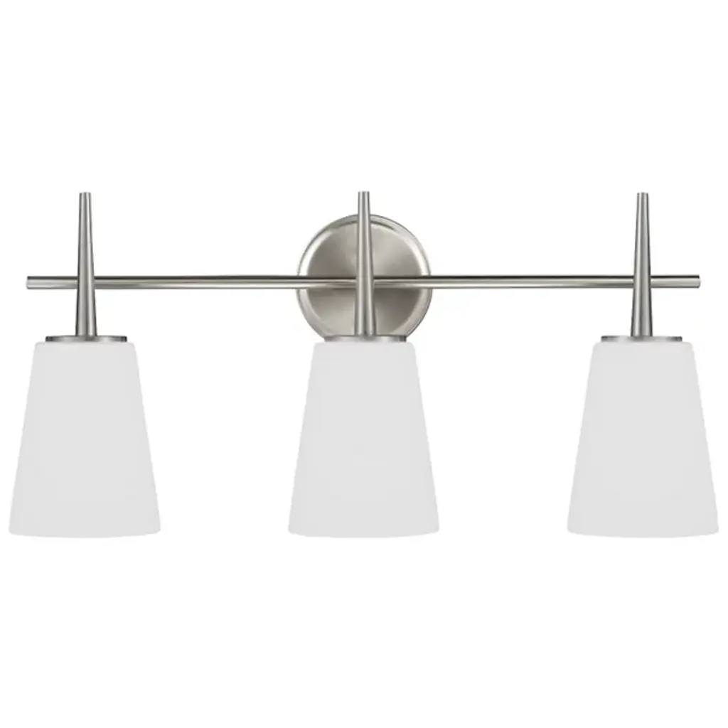 The Driscoll Vanity Light by Generation Lighting, formerly known as Sea Gull Lighting, reimagines the lighting of the 1960’s with its subtly sophisticated design and alluring ambiance. Its sleek silhouette features a series of Opal Etched glass shades that are supported by tapered Steel holders, a slim bar, and a rounded wallplate. Once lit, internal light sources radiate through the shades for an even, glare-free illumination that shimmers off the surrounding metal.