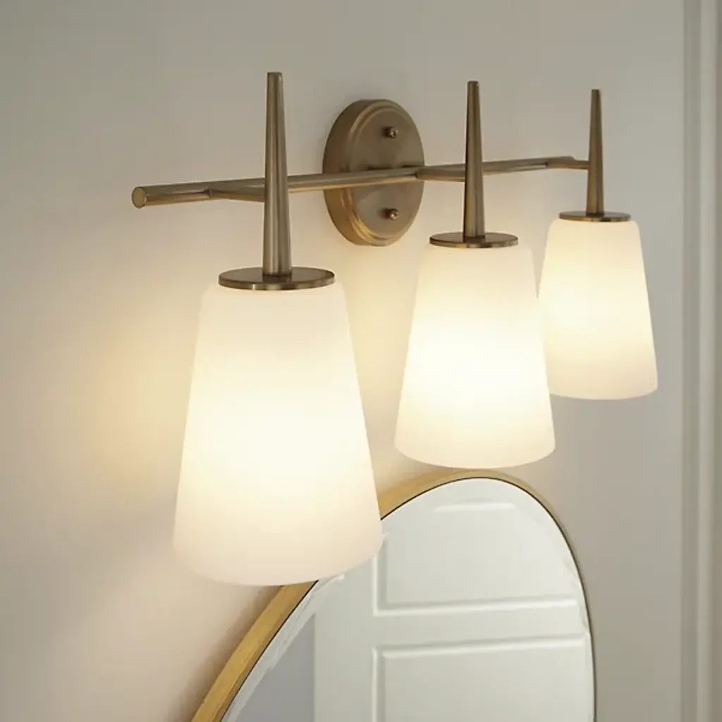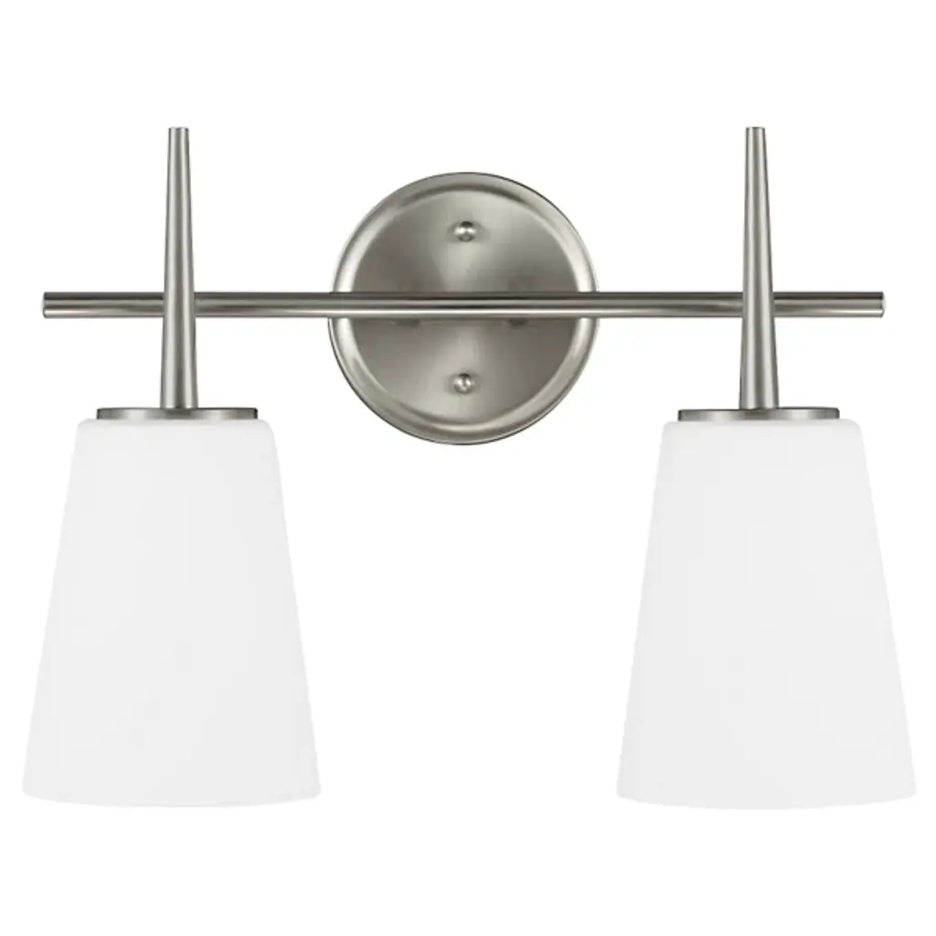 The Driscoll Vanity Light by Generation Lighting, formerly known as Sea Gull Lighting, reimagines the lighting of the 1960’s with its subtly sophisticated design and alluring ambiance. Its sleek silhouette features a series of Opal Etched glass shades that are supported by tapered Steel holders, a slim bar, and a rounded wallplate. Once lit, internal light sources radiate through the shades for an even, glare-free illumination that shimmers off the surrounding metal.