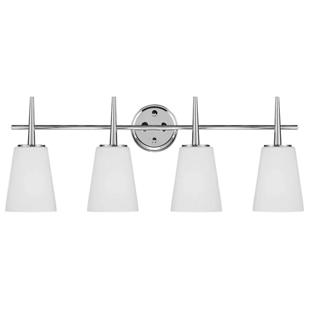 The Driscoll Vanity Light by Generation Lighting, formerly known as Sea Gull Lighting, reimagines the lighting of the 1960’s with its subtly sophisticated design and alluring ambiance. Its sleek silhouette features a series of Opal Etched glass shades that are supported by tapered Steel holders, a slim bar, and a rounded wallplate. Once lit, internal light sources radiate through the shades for an even, glare-free illumination that shimmers off the surrounding metal.