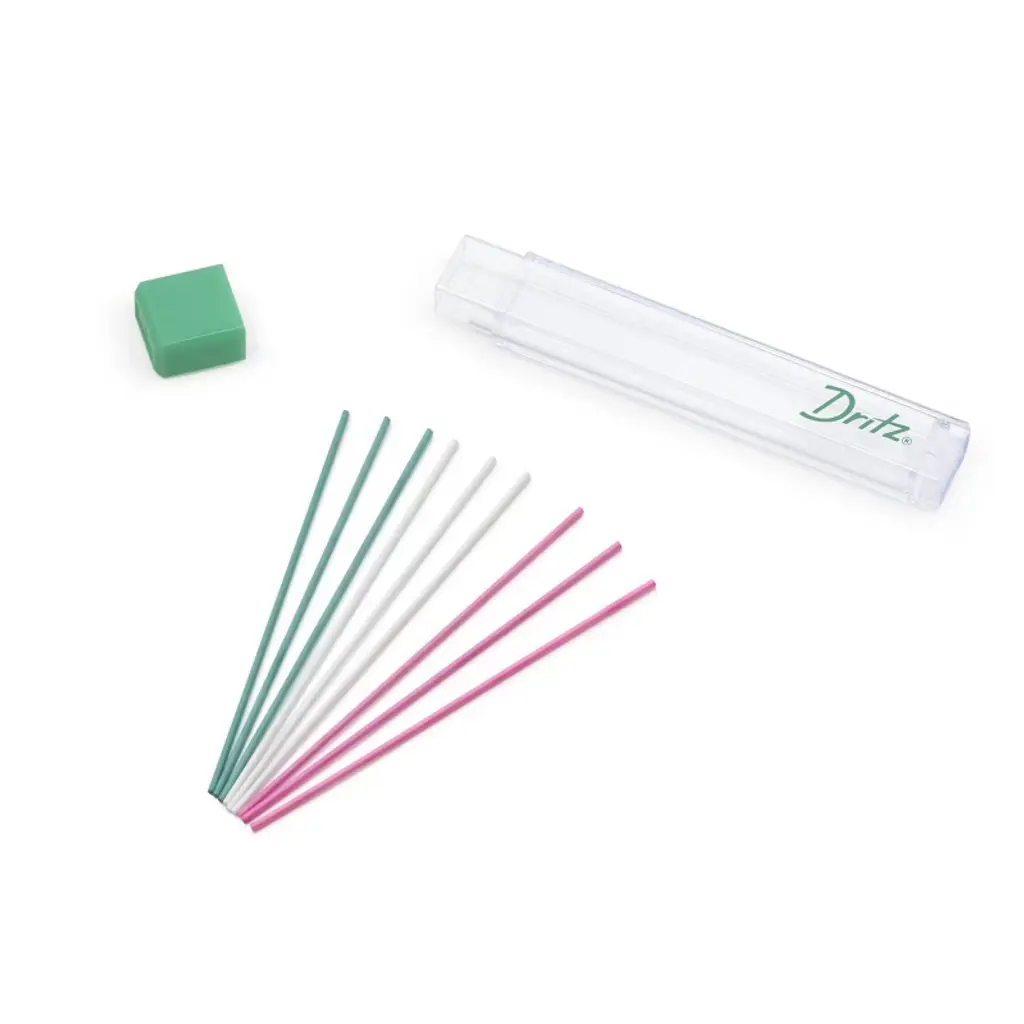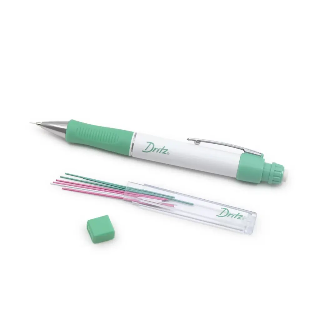Make temporary marks on your sewing, quilting and crafting projects with the Dritz Tailor's Marking Set. The pack includes a mechanical marking pencil and 0.9mm strong ceramic leads in different colors (three pieces per color). These ceramic leads are made from water-soluble dyes and are suitable for both light and dark fabrics. This tailor's marking set also features a soft finger grip for comfort. Remove markings from your fabrics by rubbing a damp cloth over them or use the eraser provided with the marking pencil.