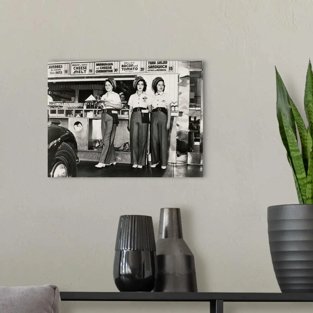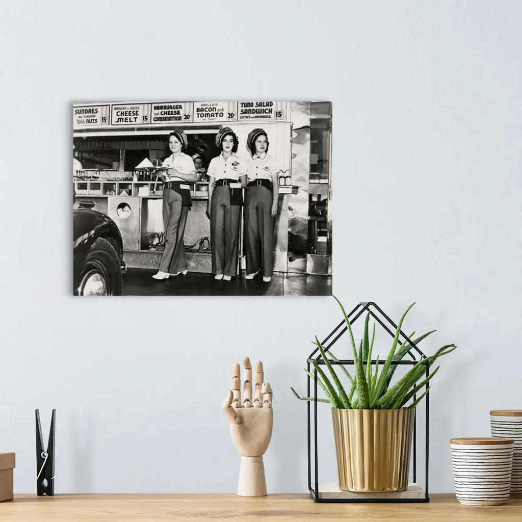 Drive-in restaurant in Hollywood, Los Angeles. June 29, 1938. The waitresses wear pseudo Highway Patrol Uniforms. The Fast Food menu includes: Hamburger and Cheese Combination; American and Swiss Cheese Melts, Grilled Bacon and Tomato on Toast; and Tuna Salad Sandwich.