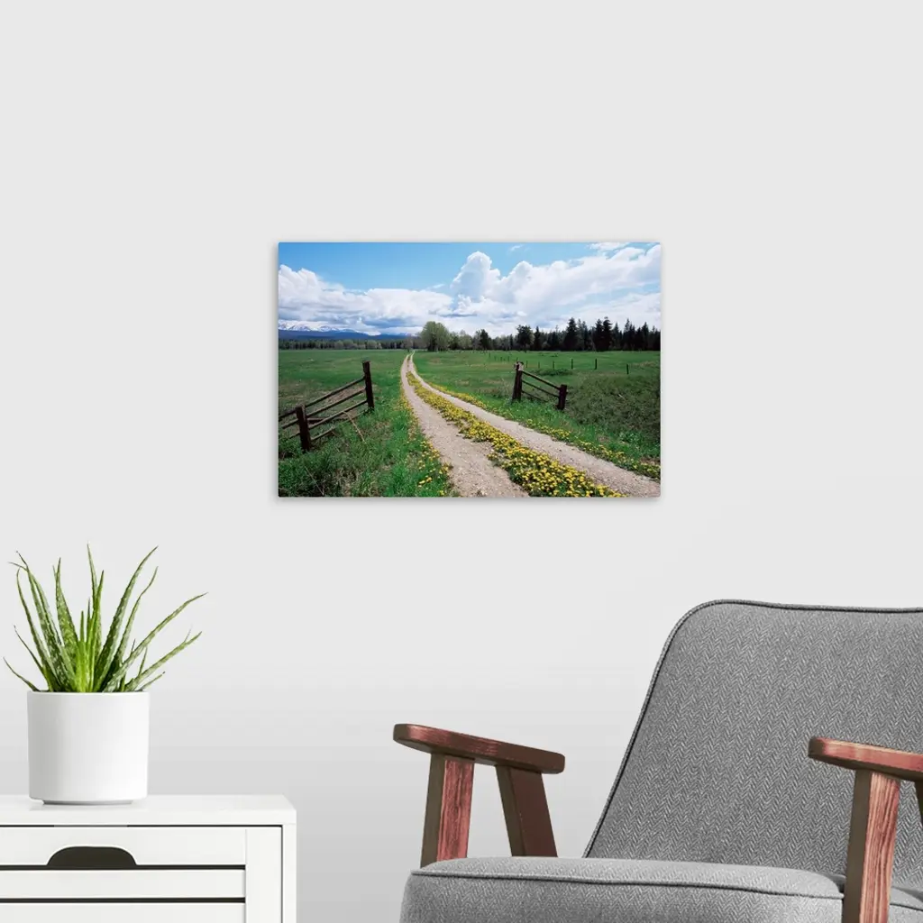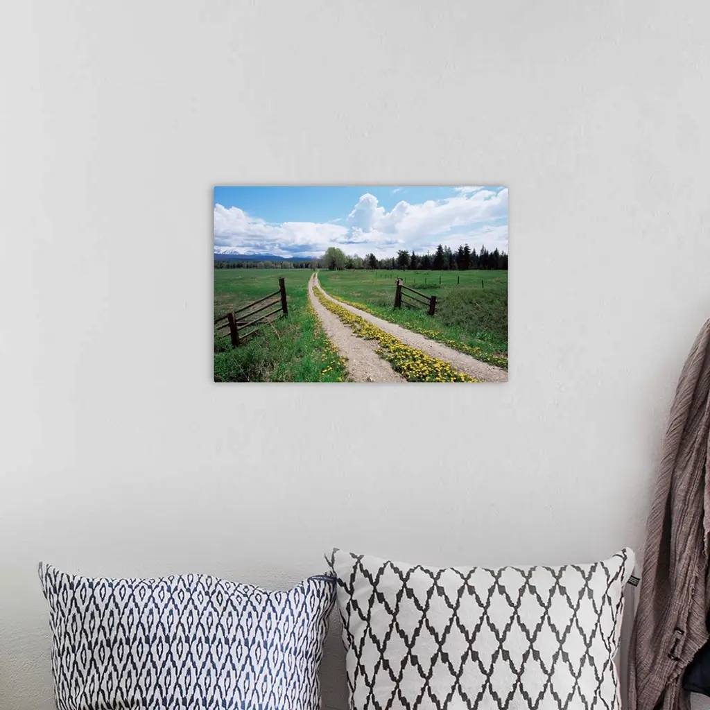 Driveway with common dandelion in flower, near Glacier National Park, Montana wall art for home and office decor. Discover canvas art prints, photos, mural, big canvas art and framed wall art in GreatBigCanvas.com's varied collections.