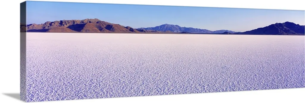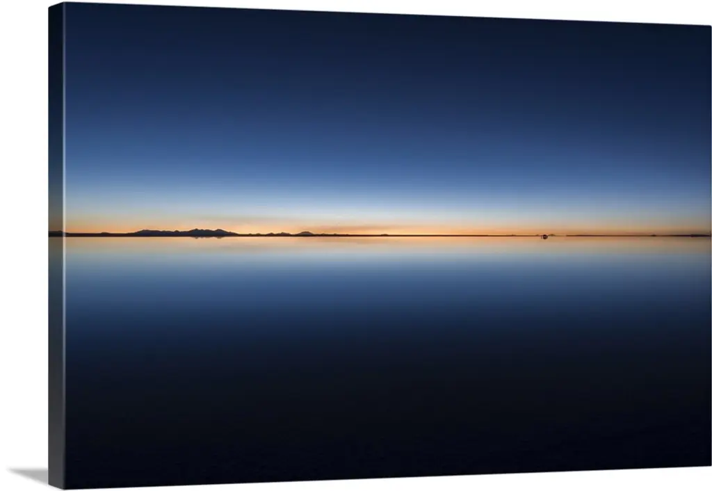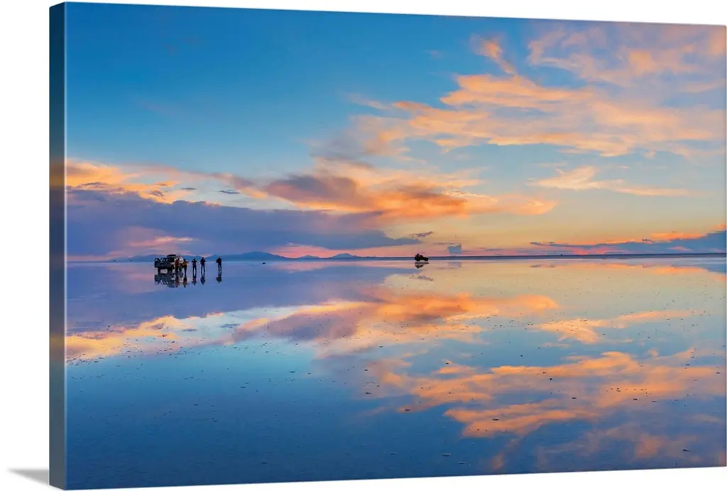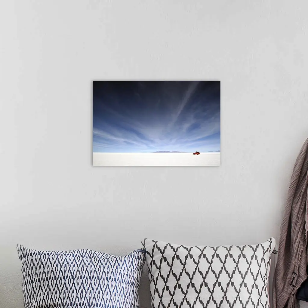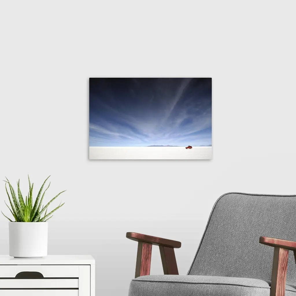 A red car traverses the Salar de Uyuni in Bolivia, a gigantic salt flat.