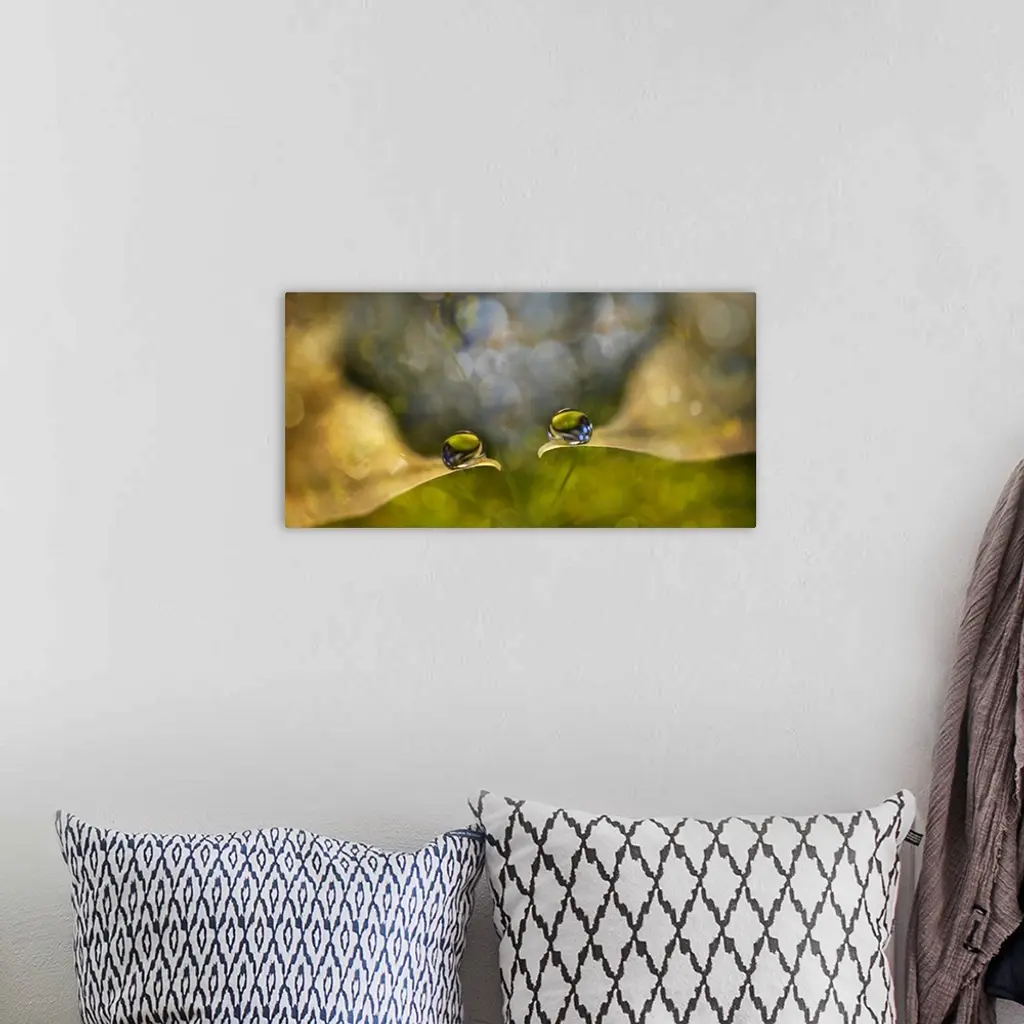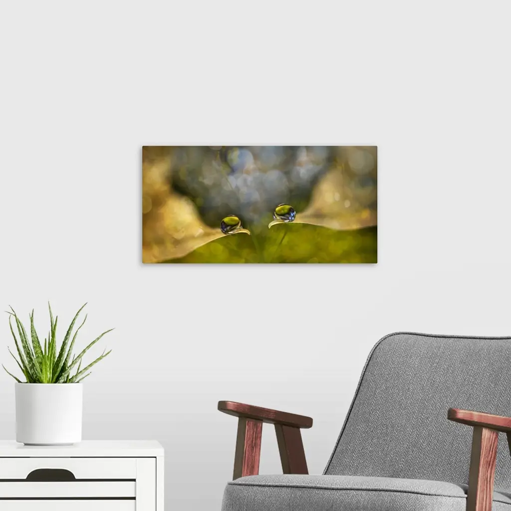 Two water droplets on the edges of leaves with bokeh lights.