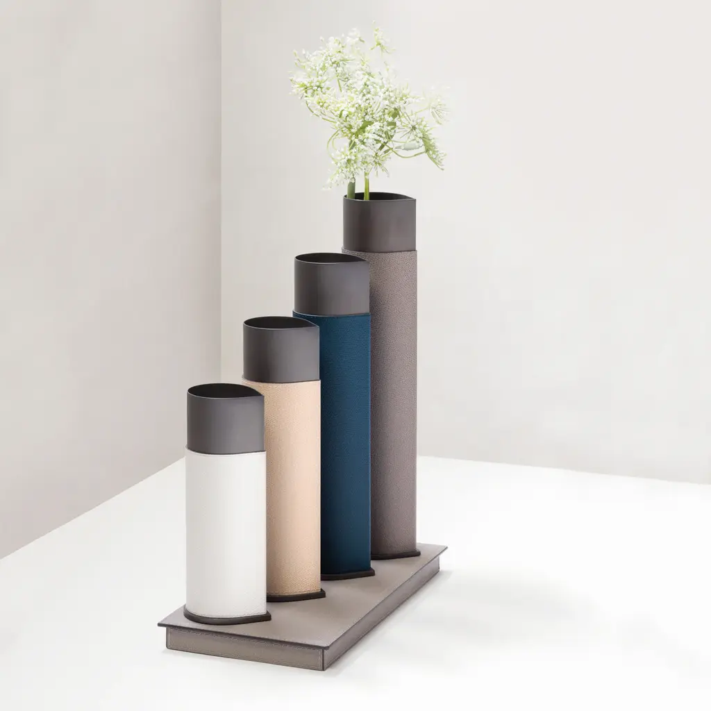 This elegant base in metal has a rectangular shape and is covered in leather. It can be used in a variety of ways, but it was designed specifically to be combined with the Drop magnetic vases. In fact, thanks to it iron core, it will provide perfect stability to them. Like all GioBagnara products, this piece can be customized depending on the client's needs. The leather can be changed in color and type, choosing from the large variety of options provided by the brand.