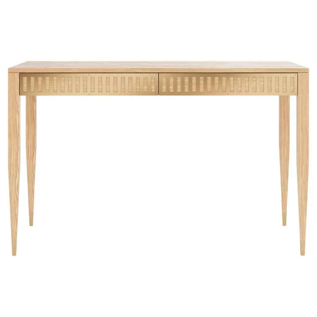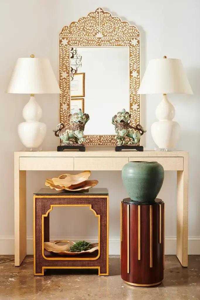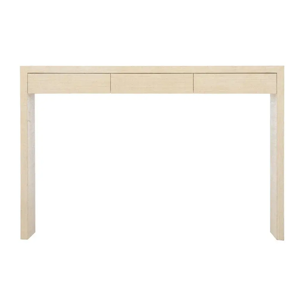The stunning simplicity of this piece belies it's beauty and utility. The versatile console has the perfect depth for most any space. It features three subtle drawers for needed storage and is covered in cream-colored raffia. Designed by Elizabeth Wicker.