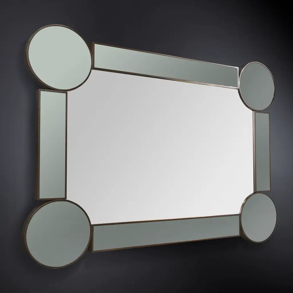 Geometric references triumph in this elegant mirror, conceived for accenting modern walls with a refined and functional element. Set in a lacquered wooden structure, the two couples of circles and rectangles making up the frame feature a sophisticated mirrored glass version, while the mirrored glass panel standing in the center comes in a standard version for a faithful reflection.