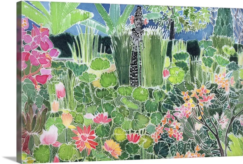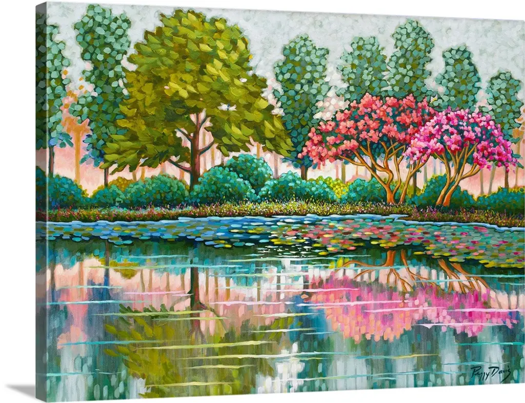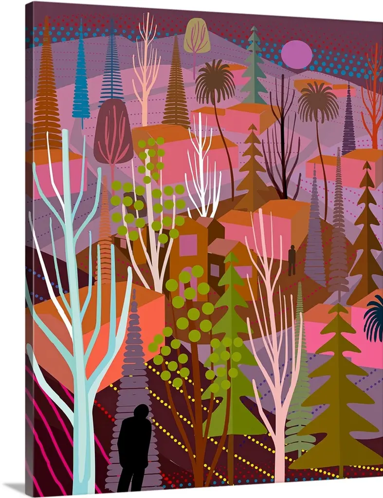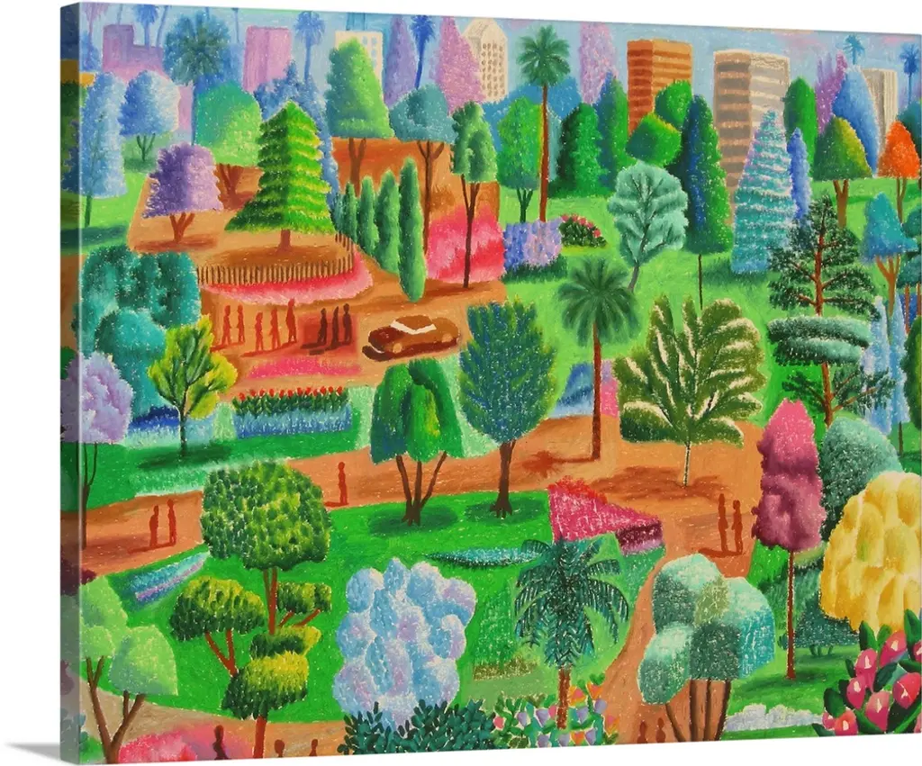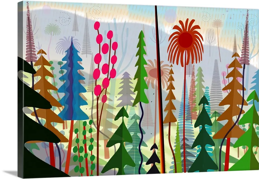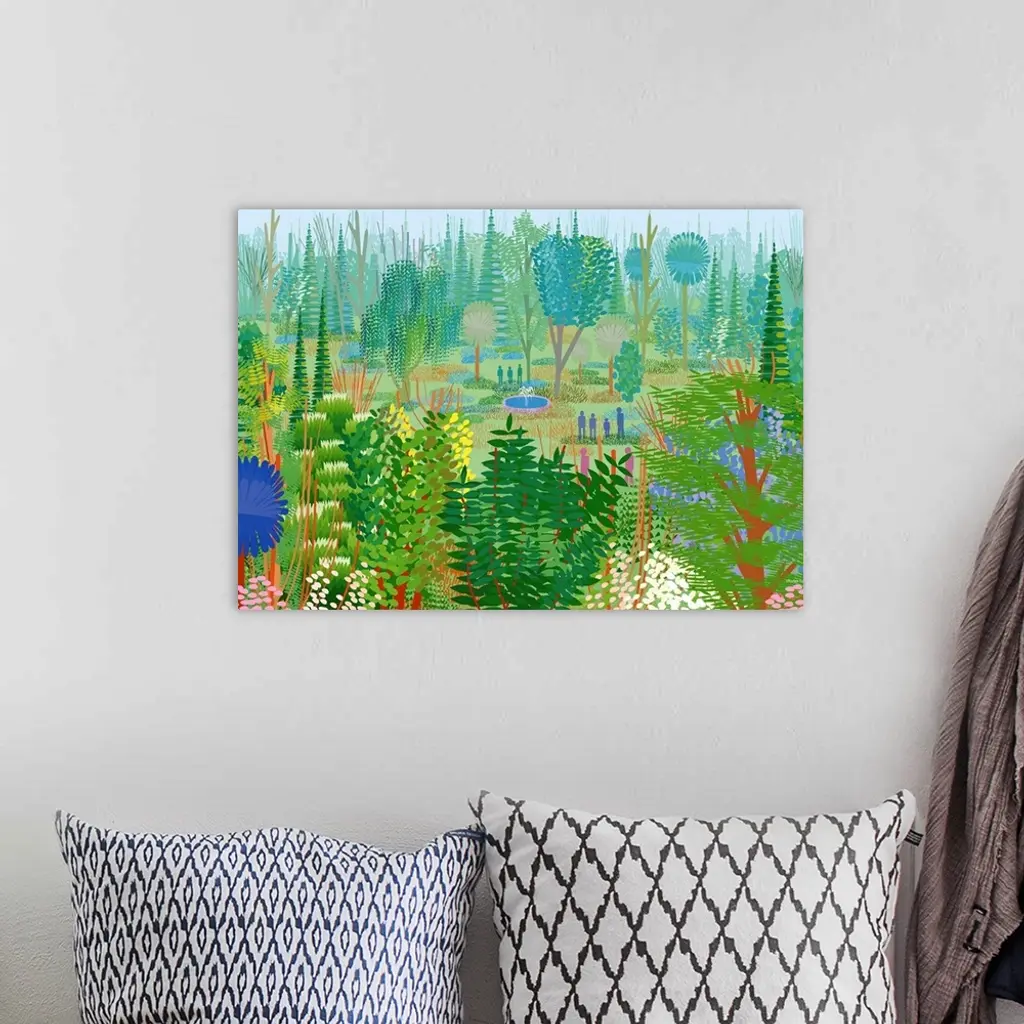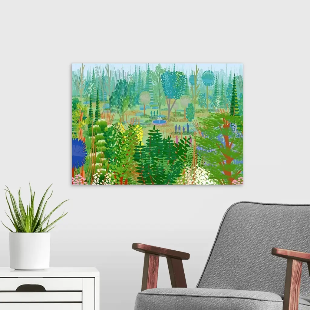 Detailed forest in background environmental mist with small figure congregating around fountain in meadow.