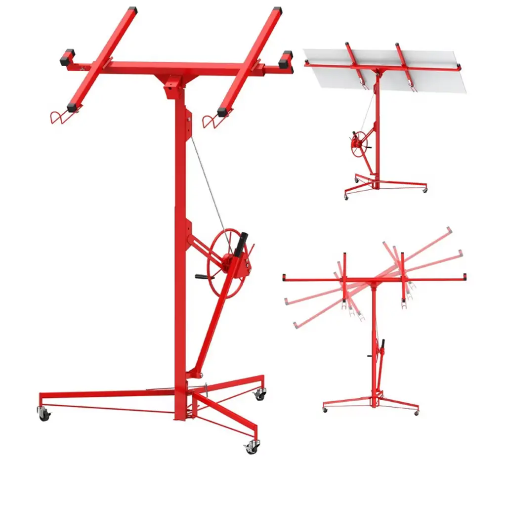 Heavy-Duty 150 lbs Load Capacity: Built from robust carbon steel, this drywall lift jack can safely support drywall panels up to 150 lbs, including standard 4x8 ft sheets. It’s perfect for ceiling installations, commercial jobs, and thick sheetrock applications, offering durability suited for daily professional use.Adjustable Height & Telescoping Arm: The telescopic arm extends from 3.5 ft up to 9.7 ft, while the overall lift height reaches a maximum of 11 ft. This makes it ideal for working on high ceilings, stairwells, and angled walls—eliminating the need for ladders or additional helpers.Flexible 60° Tilt & Full 360° Rotation: Designed with a 60-degree forward and backward tilt along with 360-degree rotation, this drywall hoist easily accommodates flat, sloped, or vaulted ceilings. It allows precise positioning of panels in tight spots without having to move the base.Stable & Secure with Locking Casters & Tripod Base: Equipped with three anti-slip locking casters and a wide tripod base, this lift ensures steady support even on uneven floors. Locking outriggers provide additional stability to prevent any movement during installation, allowing safe one-person operation.Efficient Time & Labor Saver: Compared to conventional two-person lifting, this drywall panel jack increases productivity by over 50%, saving contractors and DIY enthusiasts significant time and effort. The smooth-rolling wheels lock instantly for quick, hassle-free adjustments.