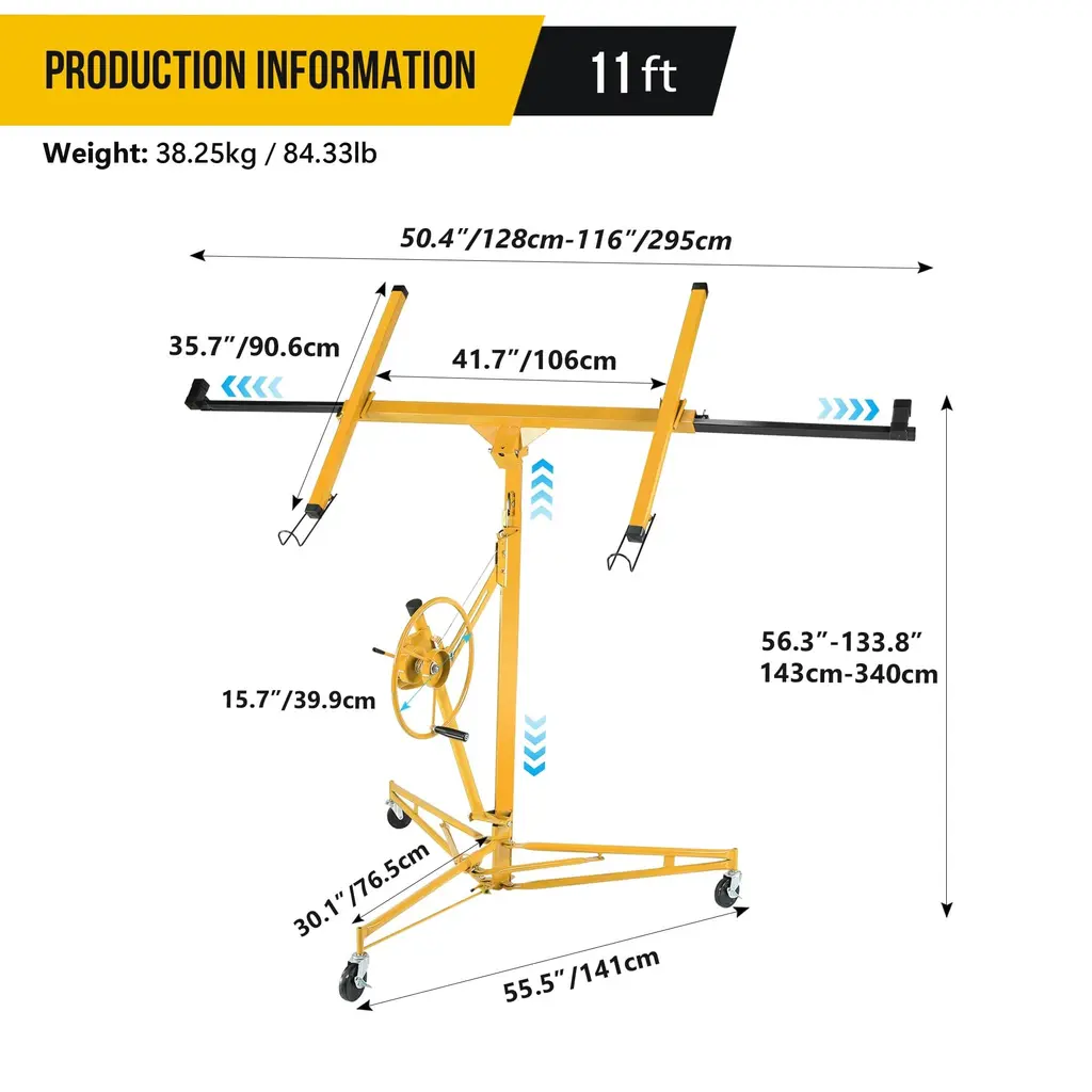 Drywall Lift 11ft, 150lb Capacity Heavy Duty Sheetrock Hoist W/telescopic Arm & Locking Wheels, Steel Panel Lifter - Yellow