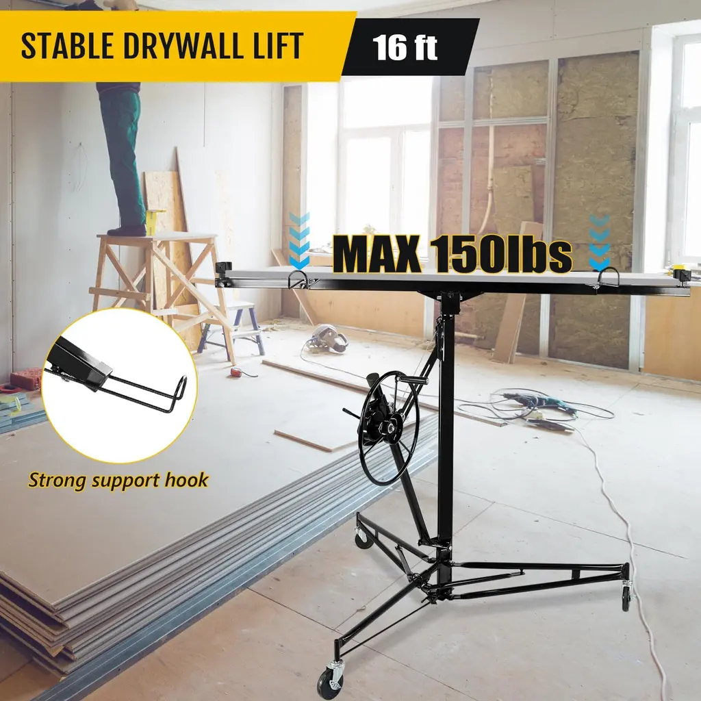 【150 lbs Heavy-Duty Lift Capacity】This drywall lift jack is constructed with heavy-duty carbon steel, supporting up to 150 lbs for 4x8 ft drywall panels. Perfect for ceiling installations, commercial projects, and thick sheetrock, ensuring long-lasting durability even under daily professional use.【Adjustable Height: 6.2FT to 16FT & Telescopic Arm】 The telescopic arm extends from 3.5ft to 9.7ft, while the maximum lifting height reaches 16ft—ideal for high ceilings, stairwells, and angled walls. No more ladders or extra labor!【60° Tilt & 360° Rotation for Versatile Angles】 Uniquely designed with 60° forward/backward tilt and 360° rotation, this drywall hoist adapts to flat, sloped, or vaulted ceilings. Easily maneuver panels into tight spaces without repositioning the base.【Stable & Safe with Locking Casters & Tripod Base】 Features 3 anti-slip locking casters and a broad tripod base for secure mounting on uneven floors. The locking outriggers prevent shifting mid-installation, ensuring one-person operation safety.【Time & Labor Saver for Pros & DIYers】 Compared to traditional 2-person lifting, this drywall panel jack boosts efficiency by 50%+, saving contractors and home renovators hours of labor. Wheels roll smoothly, then lock instantly—no wasted adjustments!