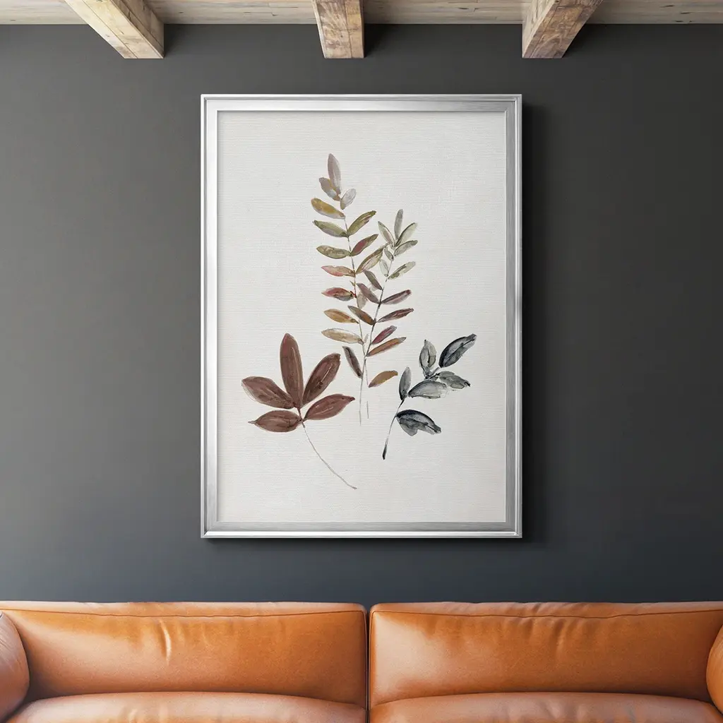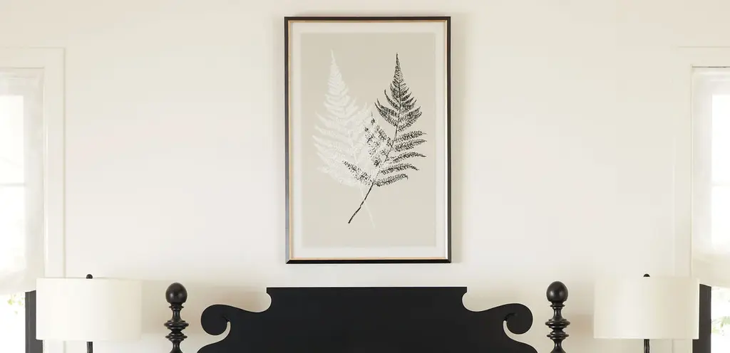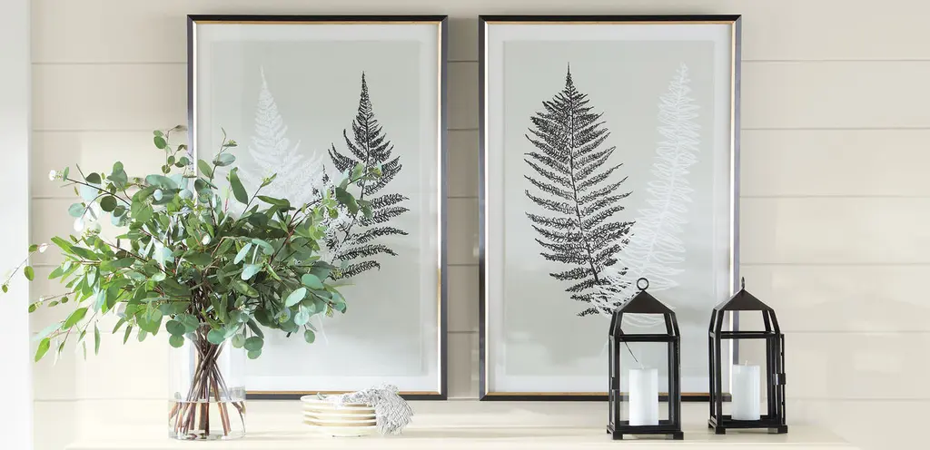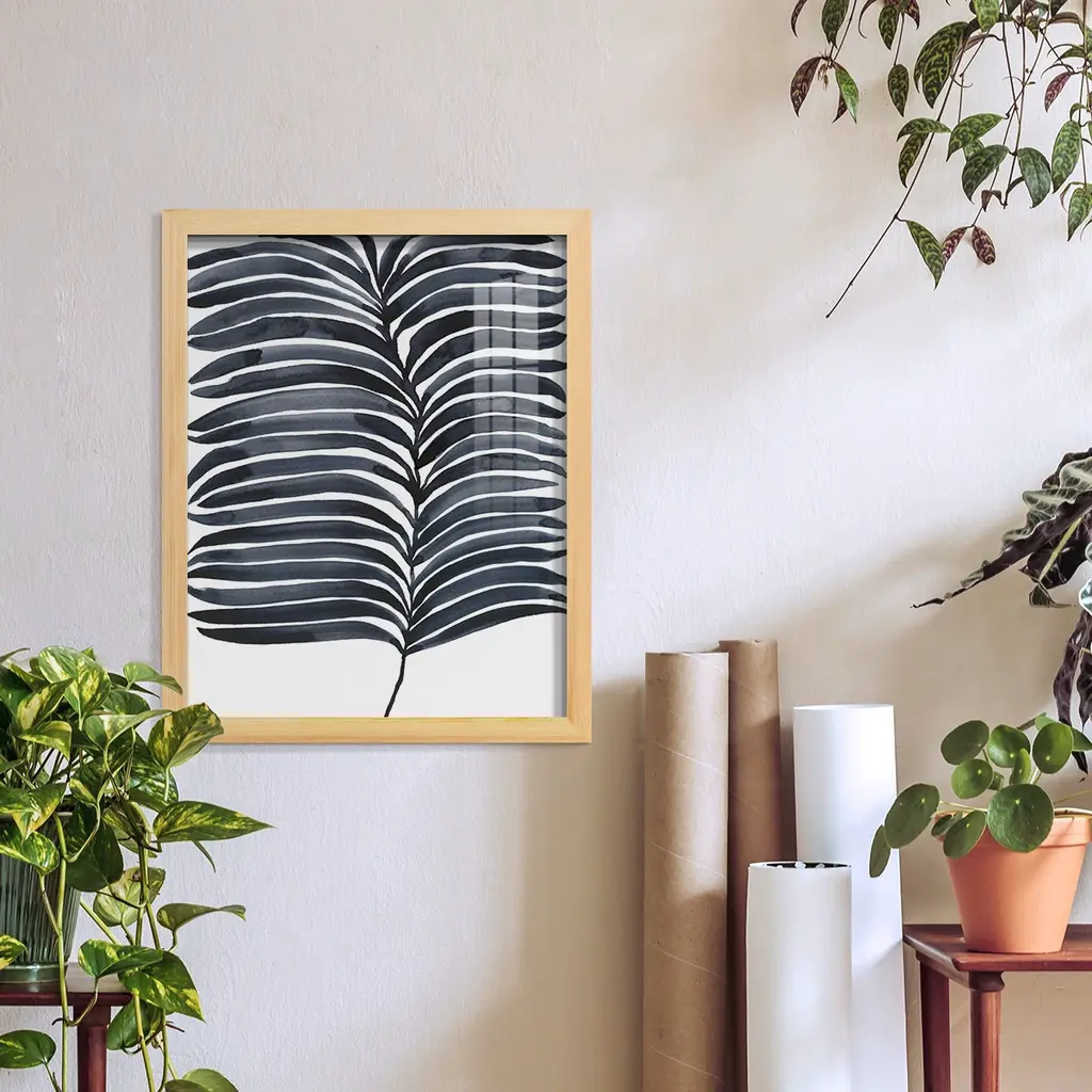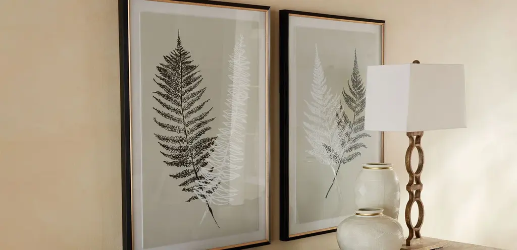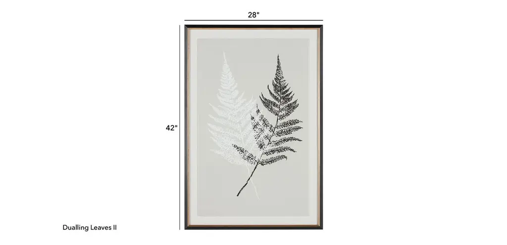 Detailed linework combined with a monochromatic palette calls attention to every detail in each pair of leaves. Entwined at their stems, each set of mirrored leaves appear to duel in the wind, adding a sense of energy and movement wherever these coordinating art prints are hung.