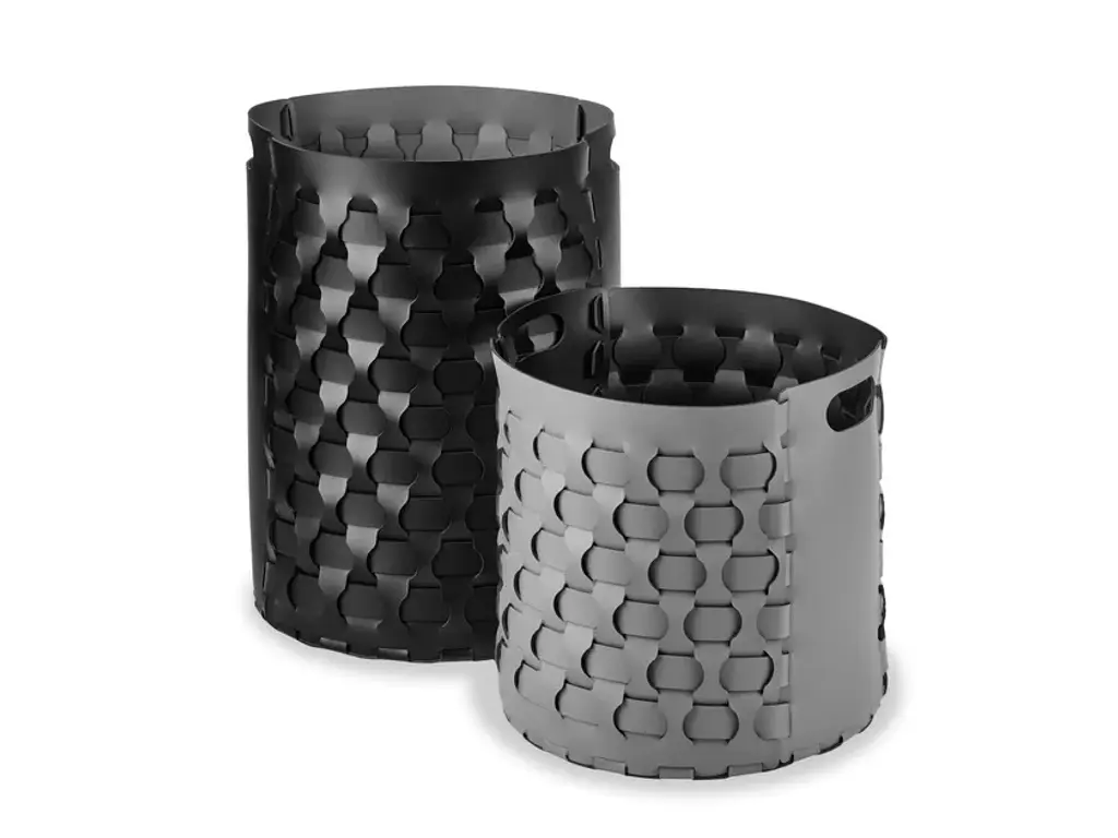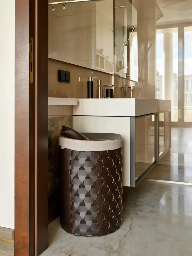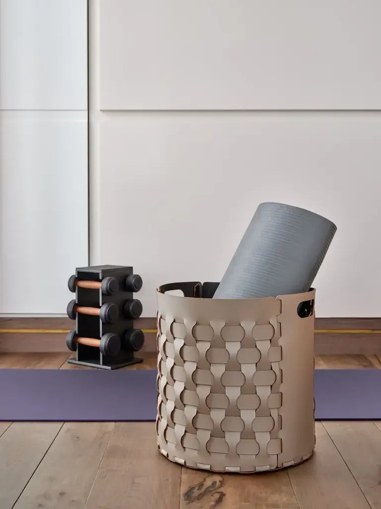 A classic big basket is essential for laundry rooms. Itomes with a textile bag inside and can be supplemented with a lid. The basket is also convenient for storing hats, blankets, toys or sports equipment. Each product utilizes ADJ's multifunctional leather, which undergoes double-sided dyeing and a specialized anti-vandal treatment, resulting in enhanced durability against wear, scratches, and abrasions.