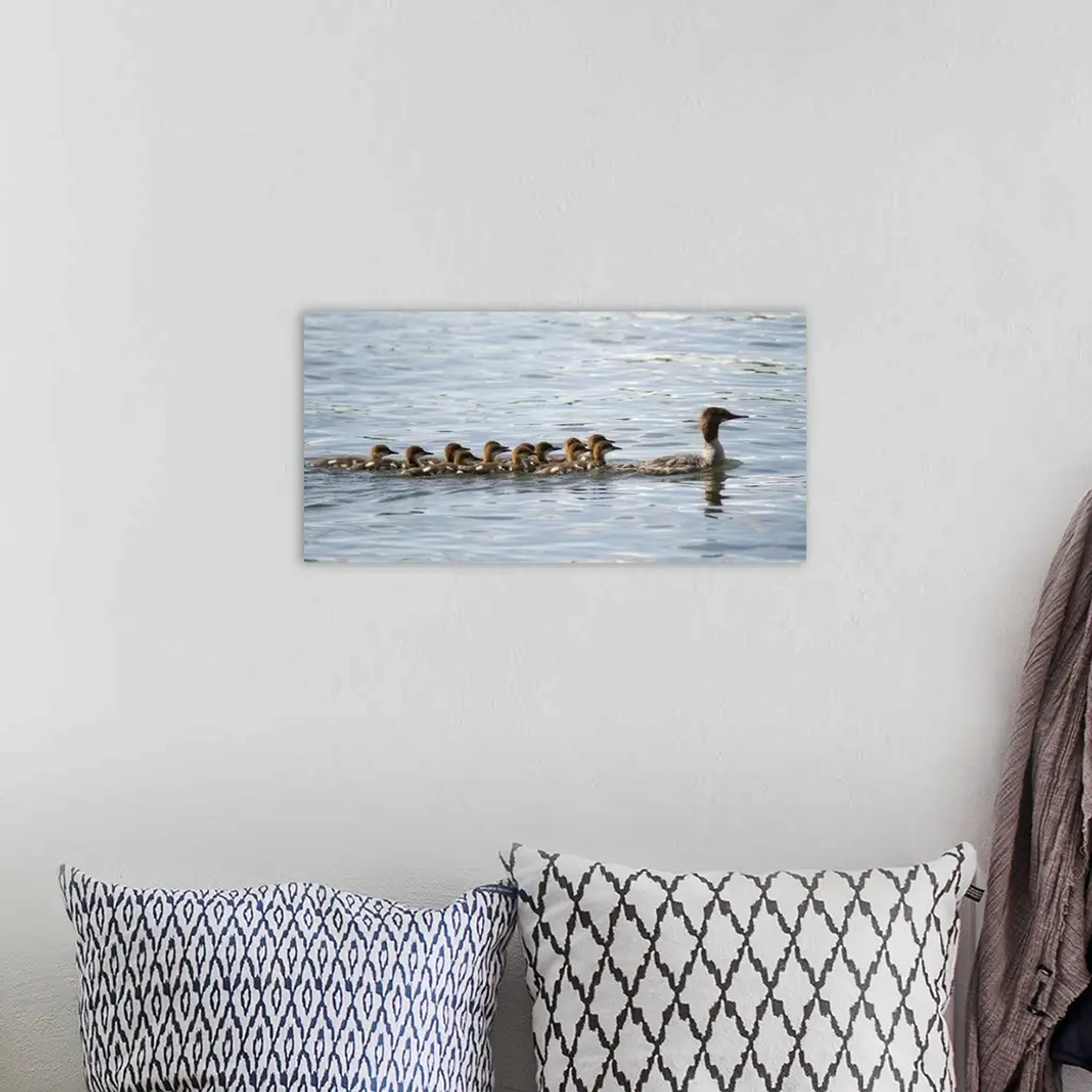 Duck And Ducklings Swimming In A Row wall art for home and office decor. Discover canvas art prints, photos, mural, big canvas art and framed wall art in GreatBigCanvas.com's varied collections.