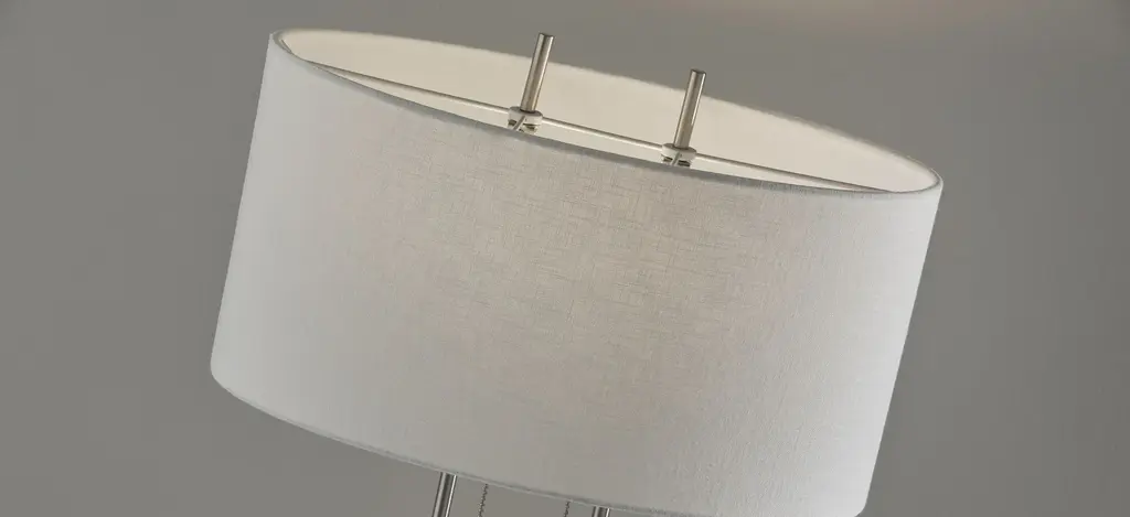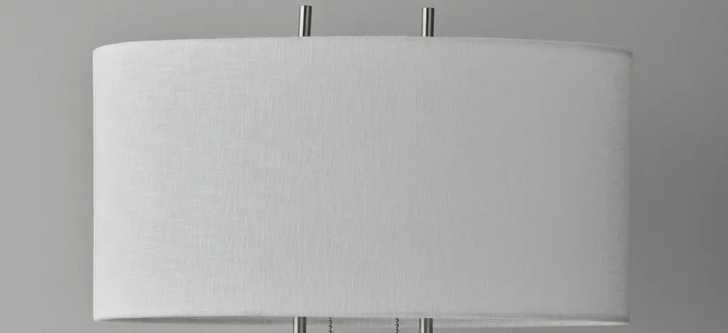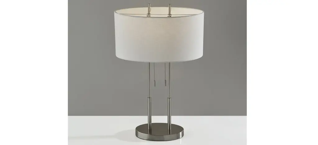 A classic contemporary pairing of brushed steel and ivory makes the Duet table lamp a perfect match for a modern or transitionally styled bedroom or living space. Two steel poles each hold a socket that is diffused with an oval shade. The steel finials create the illusion of continuous poles. Two pull chain switches, each with on/off functionality allow for a dim or bright light setting. This lamp is smart outlet compatible. Bulbs are not included.