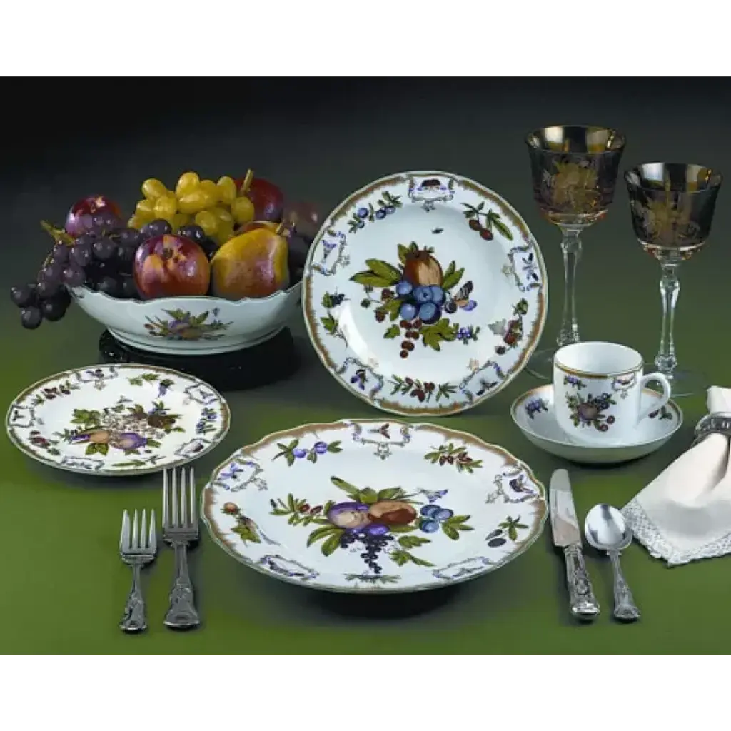 The dainty flower on the lid of the sugar bowl is handpainted before firing and makes the piece exceptional. A favorite with brides, Mottahedeh specializes in luxurious patterns and unique, elegant shapes that are reproduced from china found in museums and historical societies. The patterns feature complex and vibrant colors, and hand-painted gold decoration. The pieces are surprisingly fresh and timely, and look wonderful in both contemporary and traditional dining rooms.