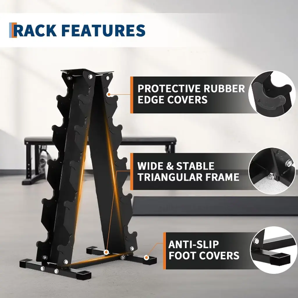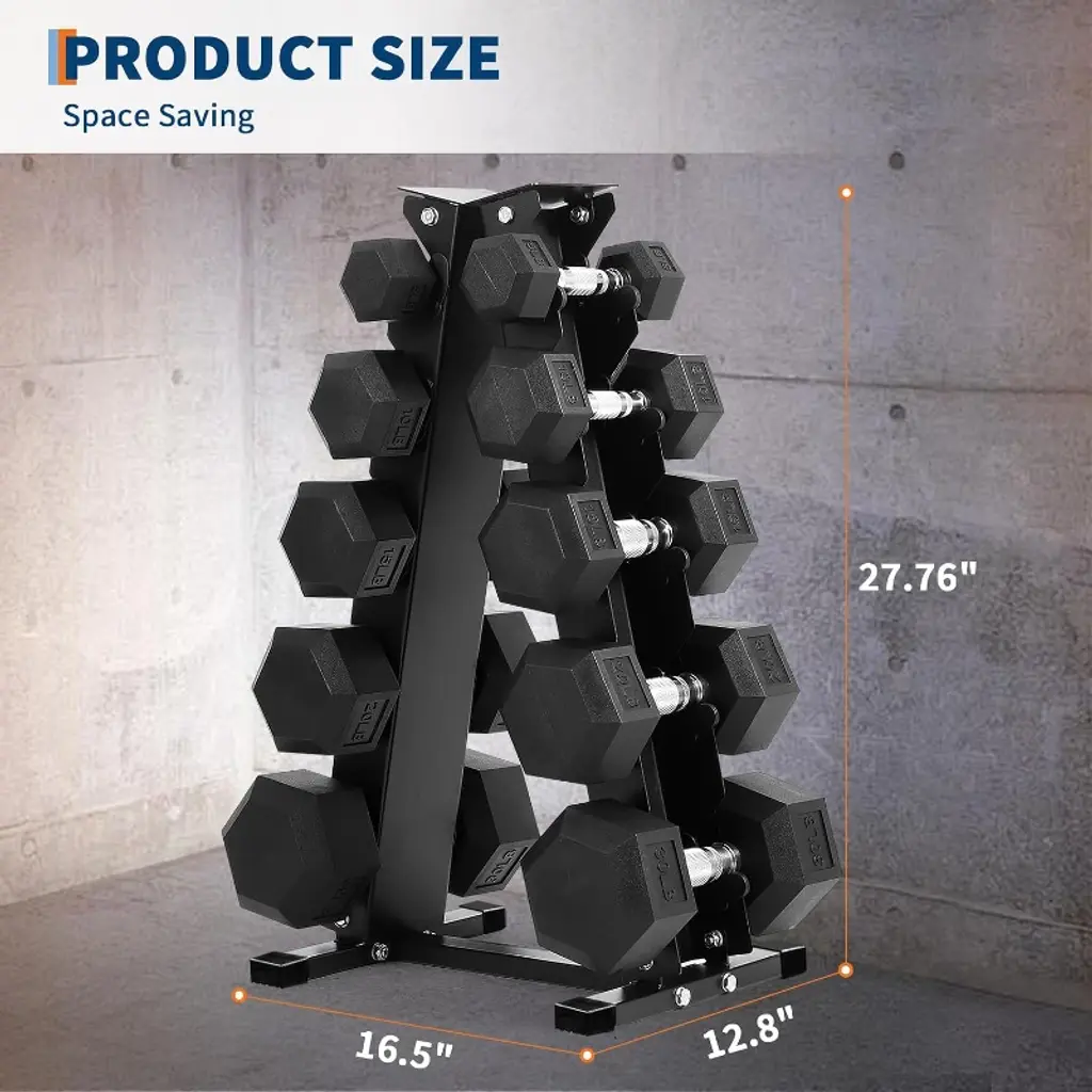 Engineered with a rock-solid triangular structure supporting up to 480 lbs, this space-saving dumbbell rack (assembled: 16.5"L x 12.8"W x 27.76"H) tucks neatly into corners to maximize your workout area. Its heavy-duty powder-coated steel construction resists rust and wear, while integrated rubber guards protect floors and walls from impacts—eliminating equipment shake for distraction-free training. Transform cluttered spaces into efficient fitness zones: this versatile organizer stores 10 dumbbells vertically, reclaiming floor space and maintaining order. Assembly takes just 15 minutes using included tools, screws, and connecting rods for instant, frustration-free organization.