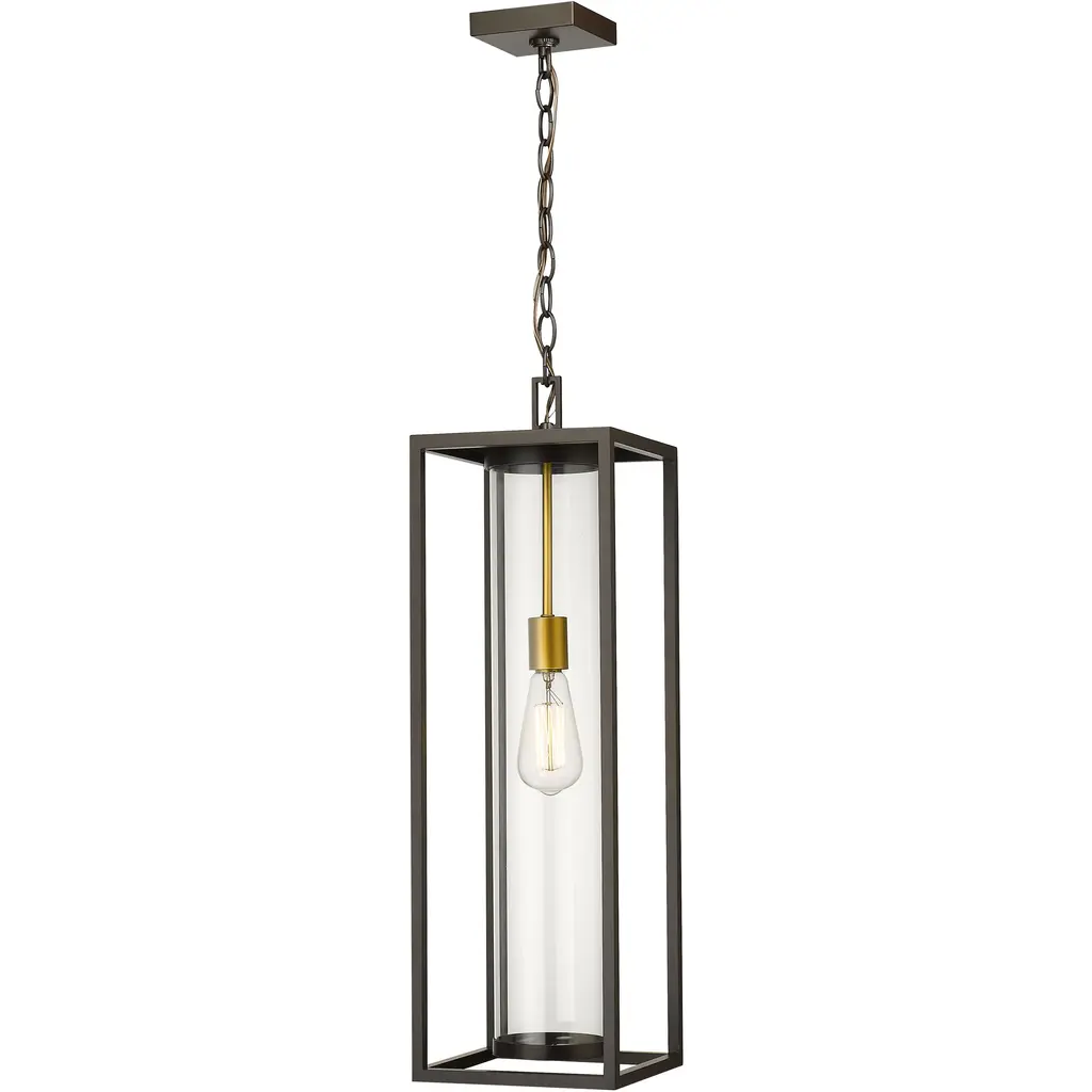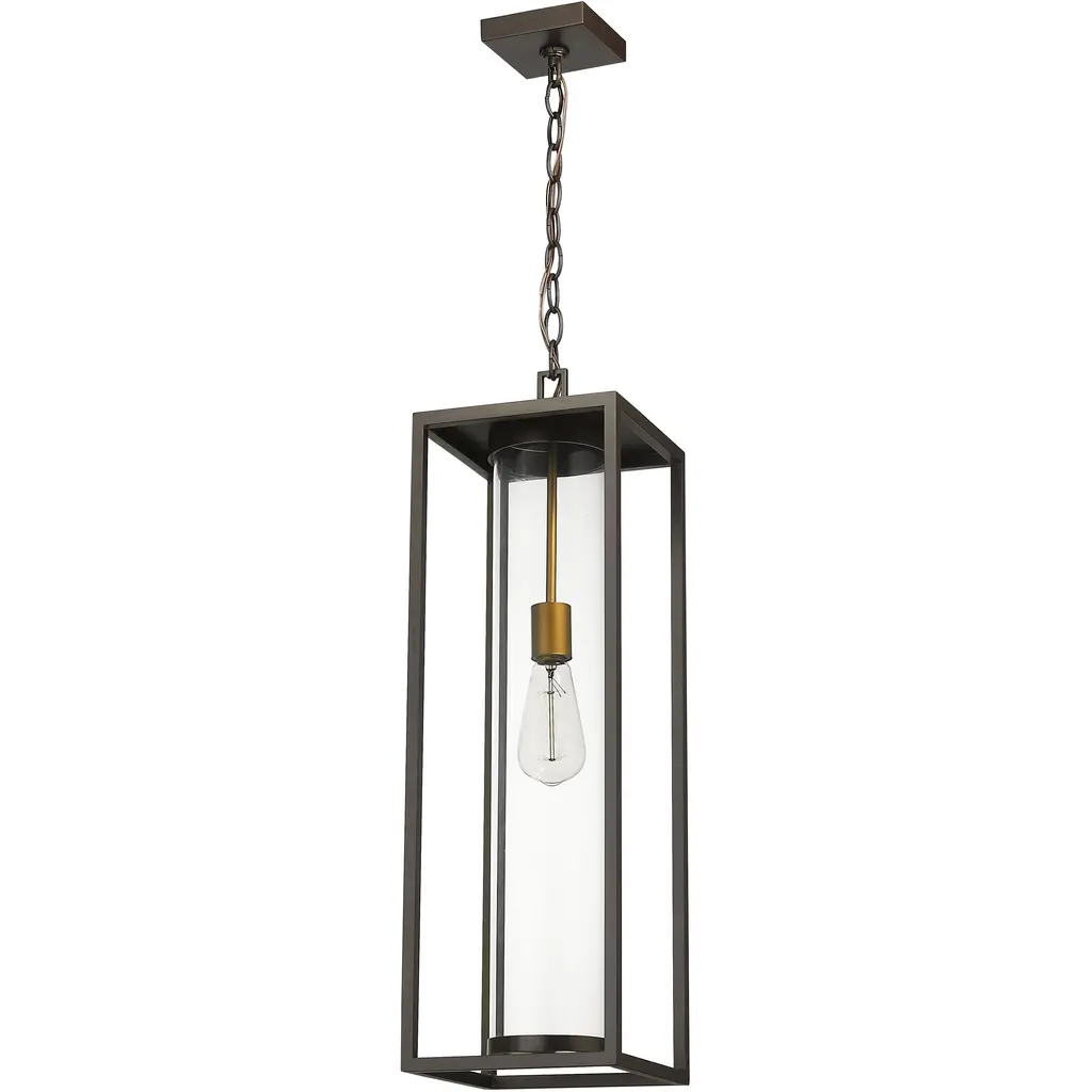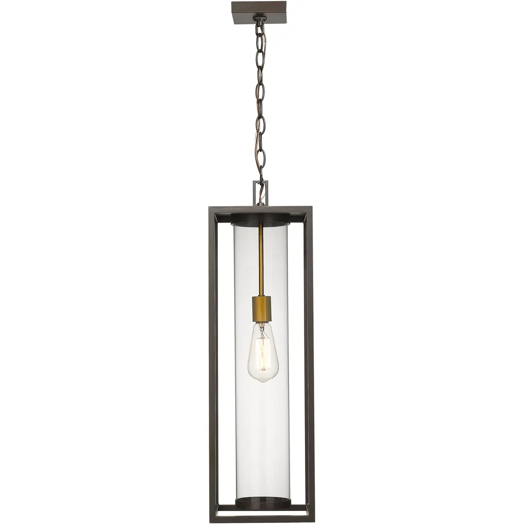 With a contemporary and minimal vibe, this modern outdoor ceiling fixture from the Dunbroch collection makes a striking addition mounted beneath a porch entrance. With a tall and open aluminum frame secured from a chain mount, it features sleek and subtle lines and a deep bronze finish. Dress up a portico or veranda with its single brass finished drop down light, encased in a clear cylindrical globe that casts a soothing glow.