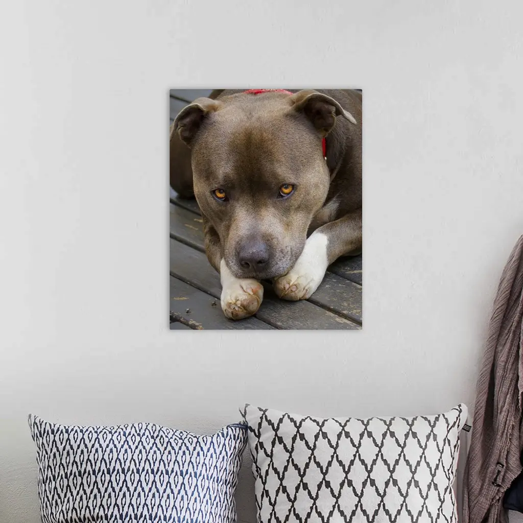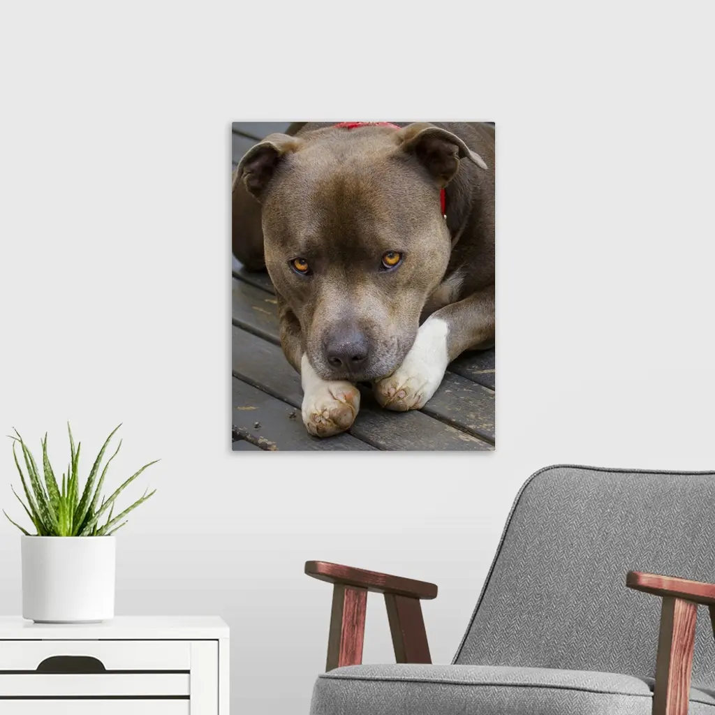 A Staffordshire Bull Terrier lying down with bright orange eyes.