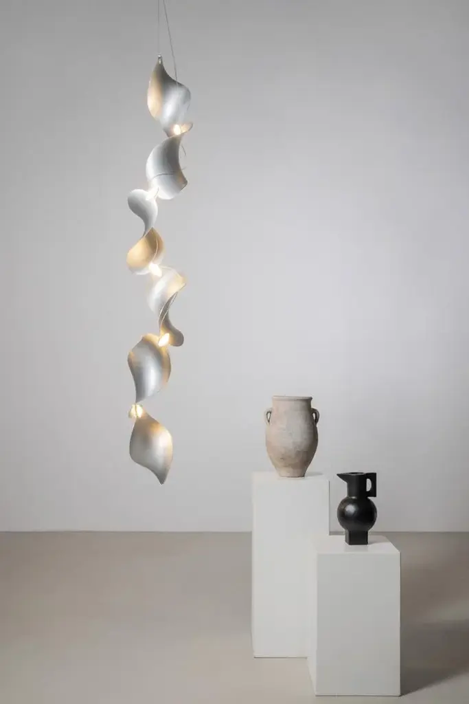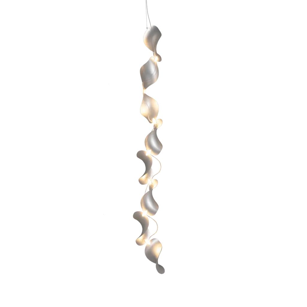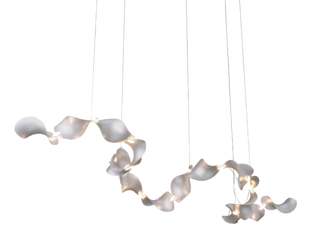 The wide, undulating curves of large sand dunes inspired us to create the modular Dune light fixture. Fascinated by the light and shadows cast by dunes that are constantly in motion, we designed organic shapes as floating objects in space. Dune can be composed of any number of shades, which are linked together using a smart connection system. The connectors are designed to be seamlessly integrated into the design while ensuring a warm, striking light distribution. Up to 250V (Europe/UK Standard).