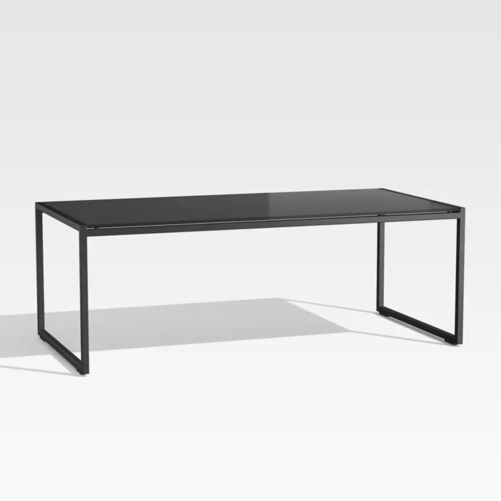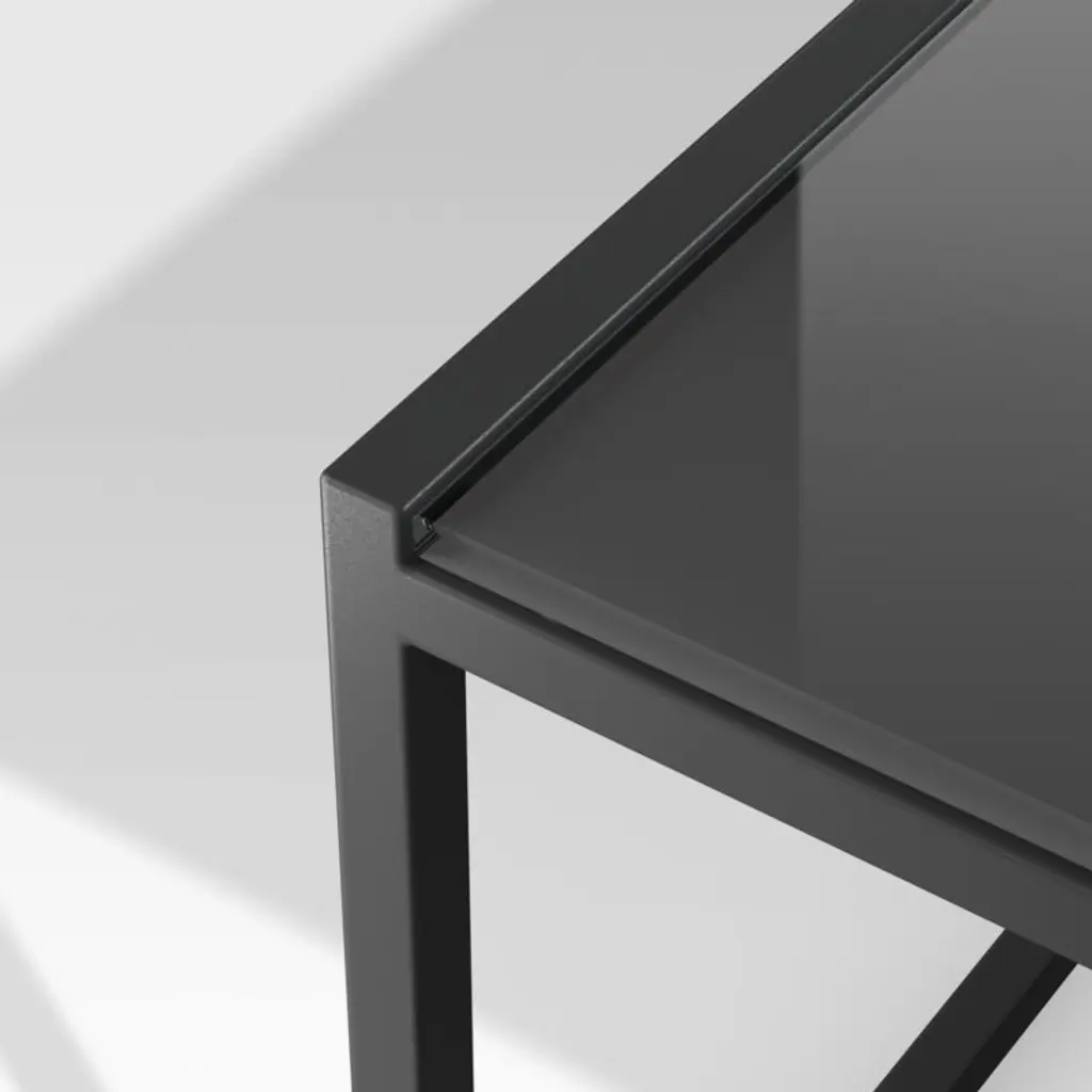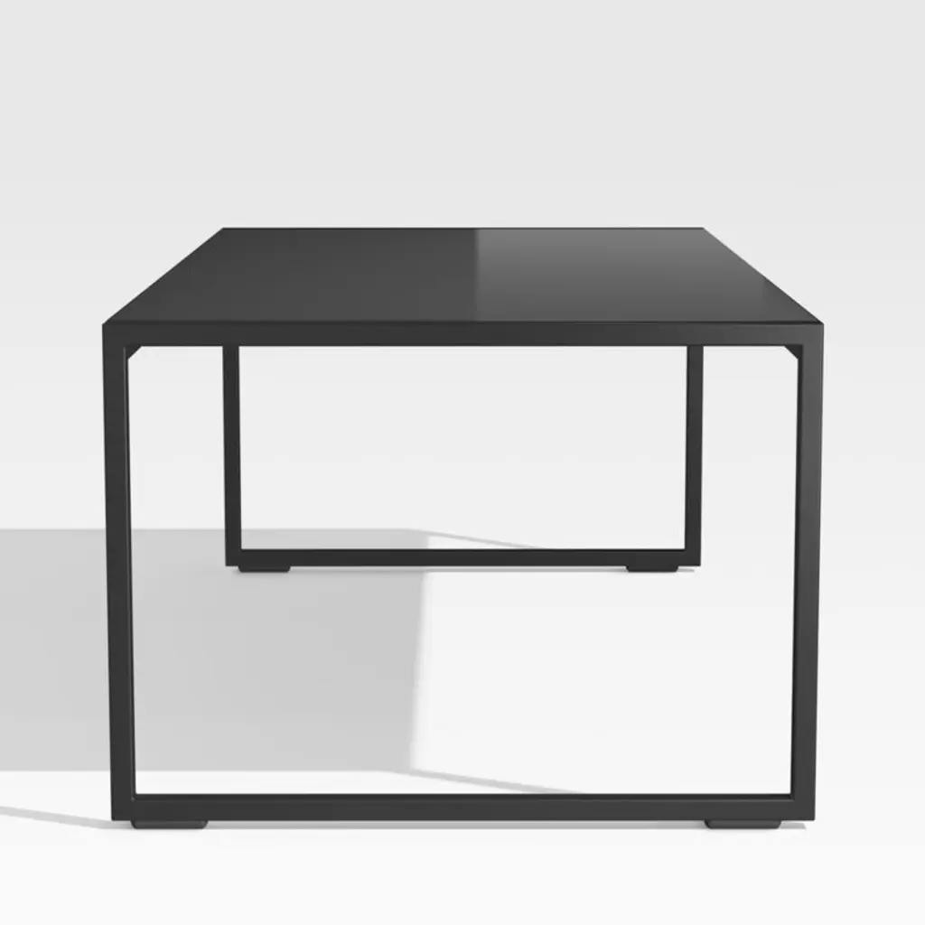 Dune's streamlined urban styling creates a truly modern "indoor room" that lives outdoors. The coffee table's linear outdoor-grade aluminum frame is topped with a sheet of tempered glass, painted black on the underside for a modern, luminous look. The outdoor coffee table frame is handcrafted with precisely mitered corners and steps of hand-work to create the seamless finish.