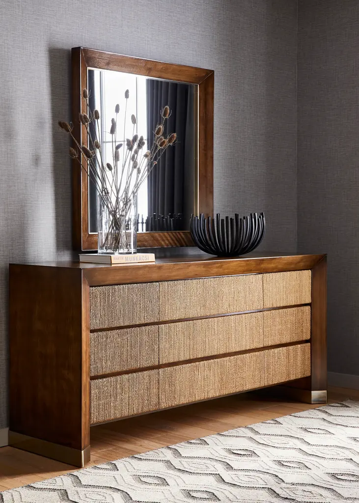 Vanguard Furniture's artisans hand-apply all finishes, taking careful steps to ensure each piece has the care and attention required to enhance the natural character of the furniture. No two pieces are the same — every piece of furniture is truly unique. Vanguard's Dune Dresser features nine drawers with finger groove pulls, Lampakanay wrapped drawer faces, white Bronze ferrules, Cavallo finish and has no hardware. Material: Bleached Walnut Veneers / Hardwood Solids