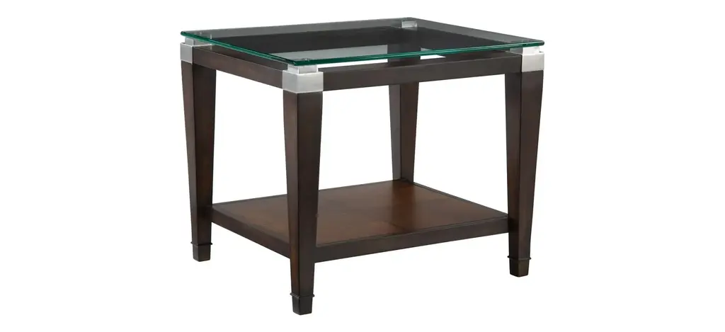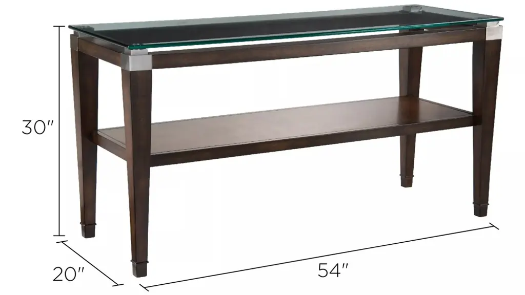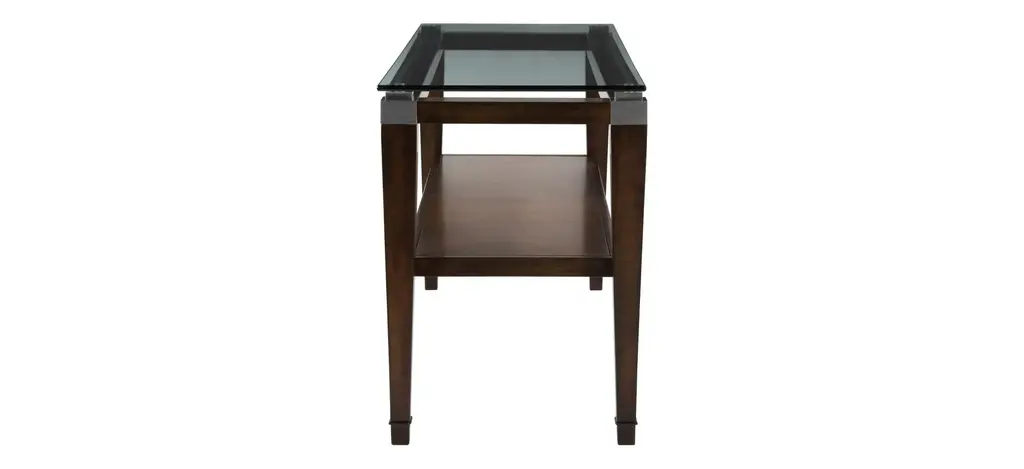 A unique console table can really draw in the personality of a room, and this Dunhill glass console table will give your living room the touch of character it needs. Its warm walnut finish is accentuated by a 1/2 in. floating glass tabletop and brushed-nickel corner supports. The console table's lower shelf is the perfect place to add decorative accent pieces.