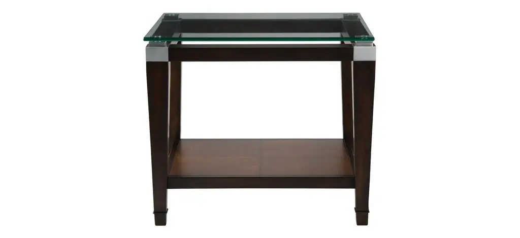 A unique end table can really draw in the personality of a room, and this Dunhill glass end table will give your living room the touch of character it needs. Its warm walnut finish is accentuated by a 1/2 in. floating glass tabletop and brushed-nickel corner supports. The end table's lower shelf is the perfect place to add a decorative accent piece.
