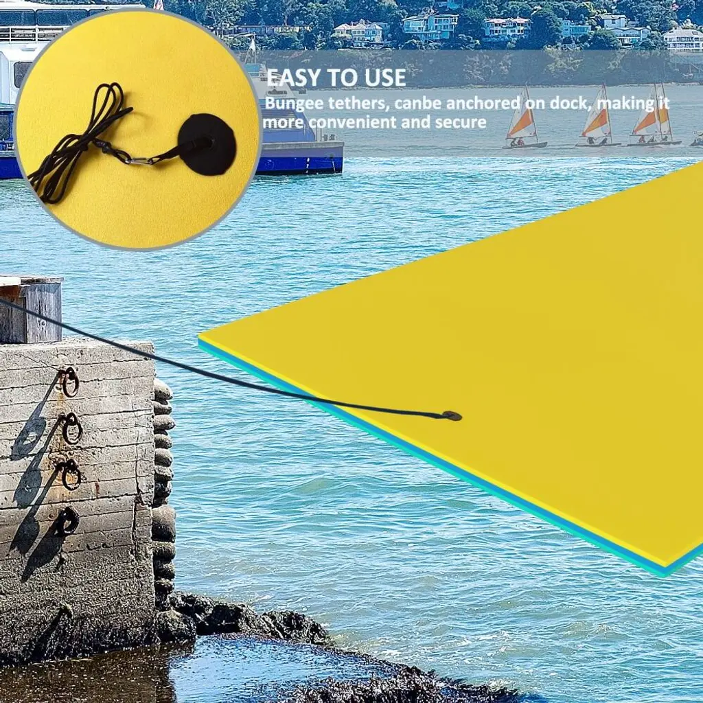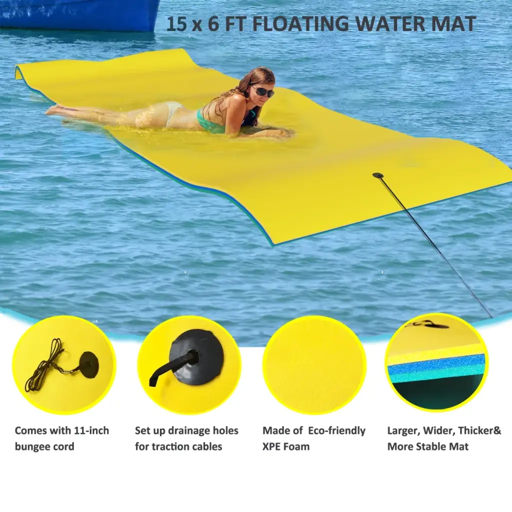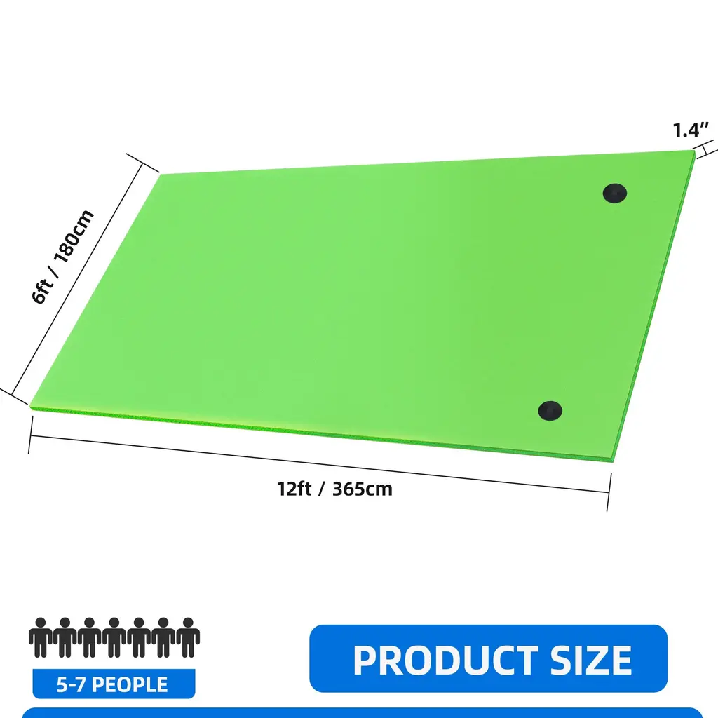 It's time to sunbathe in the water with your friends! This water mat is perfect for entertaining and relaxing with family and friends in water parks, pools, lakes, rivers and the sea. Available in three different sizes: 15ft supports up to 1100 lbs and can accommodate 4-6 adults. 12ft maximum support weight is 880 lbs, can accommodate 3-5 adults. 9ft maximum support weight is 800 lbs, can accommodate 2-3 adults. Unfold this water mat in your favorite pool, lake or ocean to create your own floating island for everyone around you to enjoy.Features:
