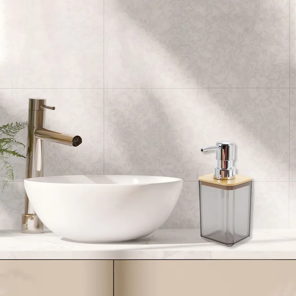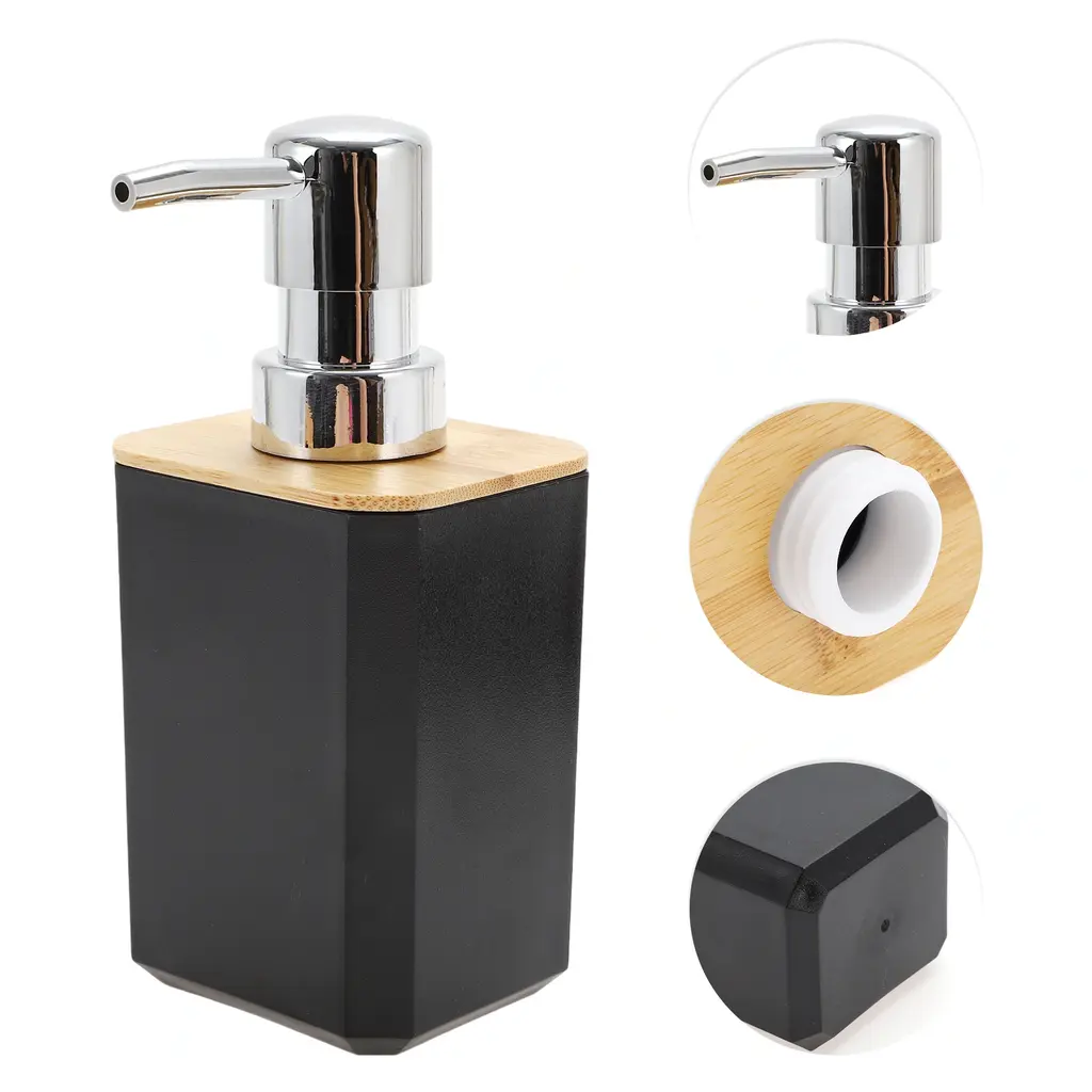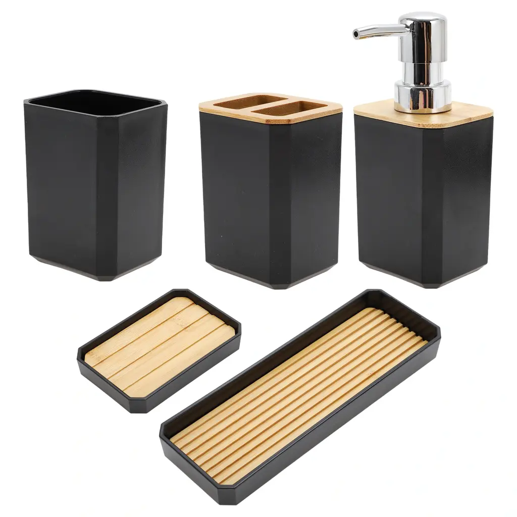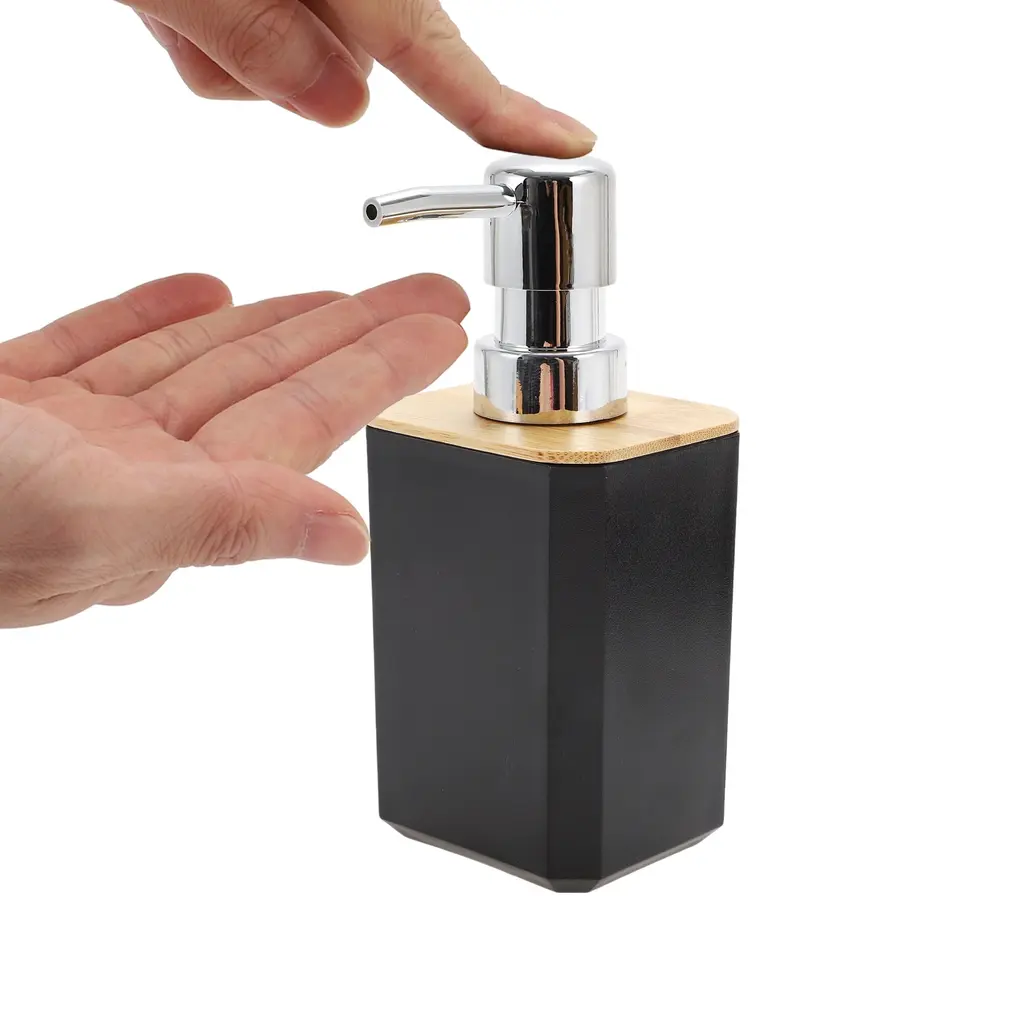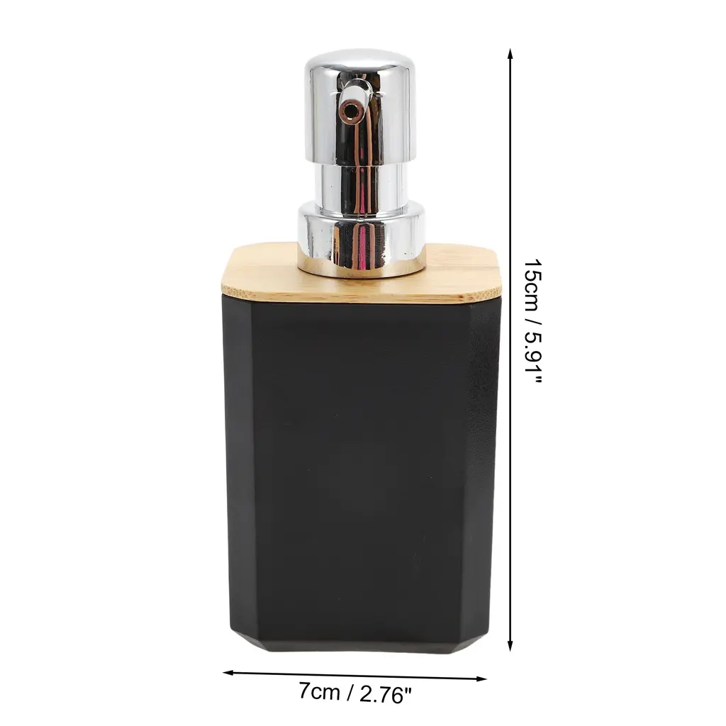 Feature:Liquid soap dispensers set are a more stylish home decor for kitchen and bathroom countertops.Stylish and modern design, simple yet elegant, adding a touch of sophistication to everyday essentials.Easy to pump, falls well on hands when pressed and does not spray on clothes.Specification:Color: BlackMaterial: Plastic, BambooBath Bottle Size: 7x6x15cm / 2.76"x2.36"x5.91"(L*W*H)Toothbrush Holder Size: 7x6x10cm / 2.76"x2.36"x3.94"(L*W*H)Mouthwash Cup Size: 7x6x9.5cm / 2.76"x2.36"x3.74"(L*W*H)Soap Box Size: 12x8cm / 4.72"x3.15"(L*W)Tray Size: 22.5x8cm / 8.86"x3.15"(L*W)Package Included: 1 Set Soap Pump Dispenser