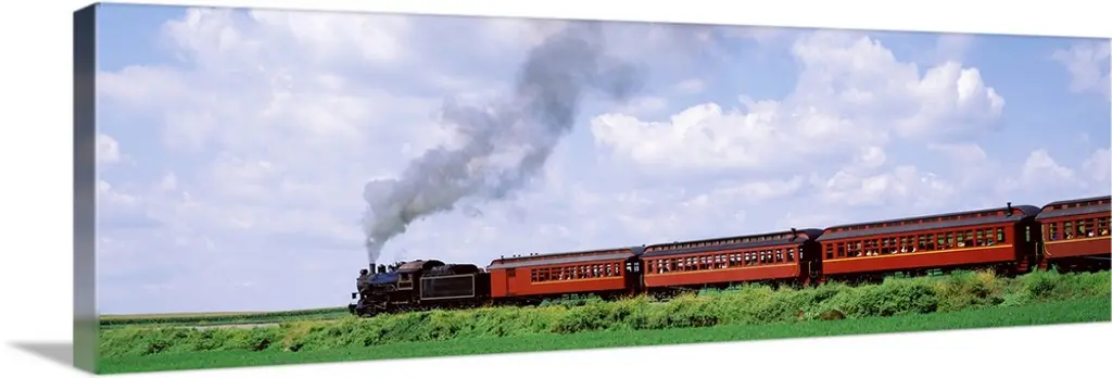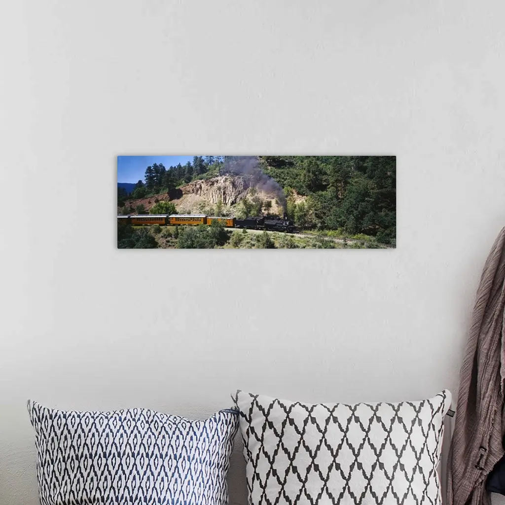 This is a panoramic photograph of a vintage engine and train cars passing through the mountains on a sunny day.