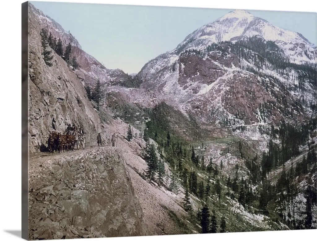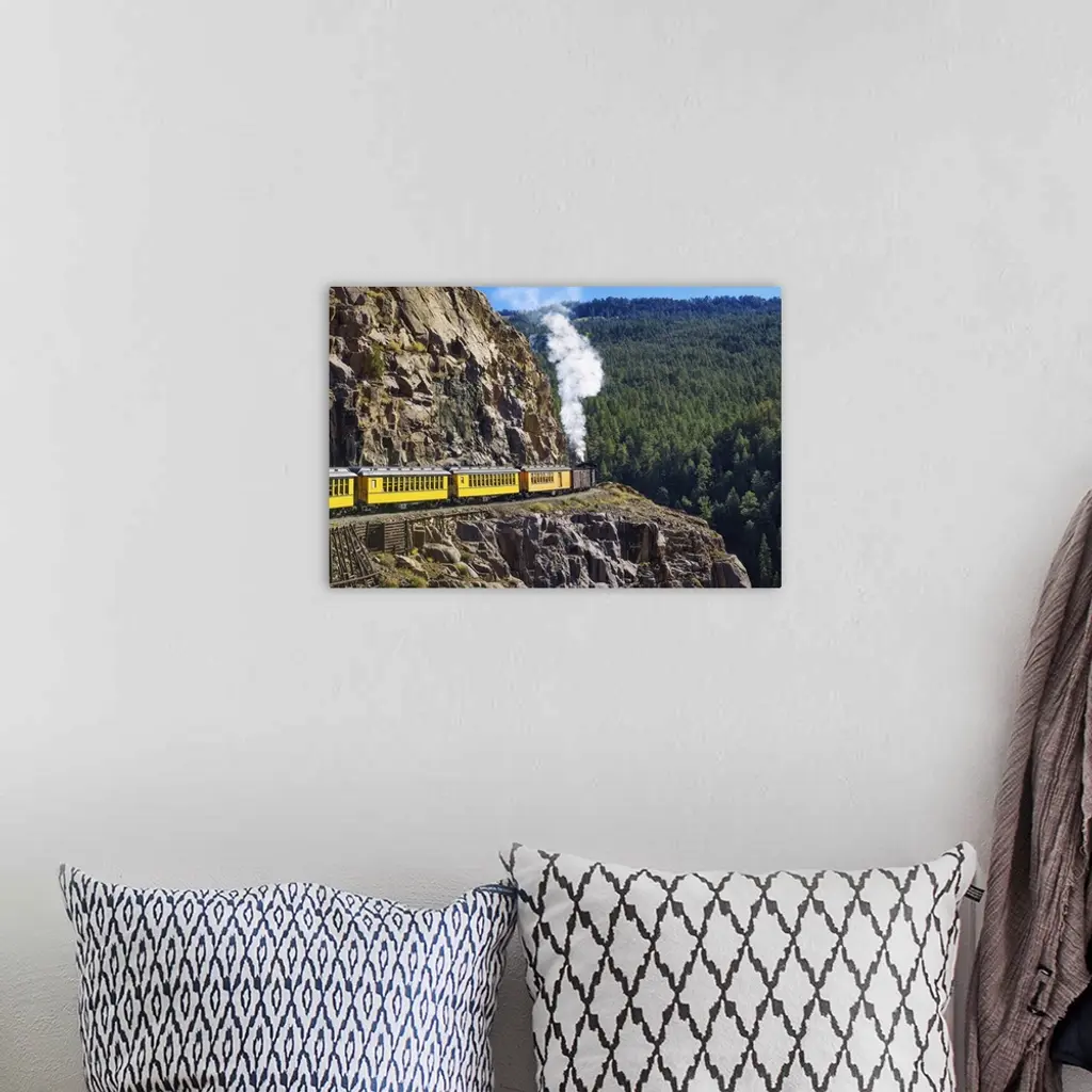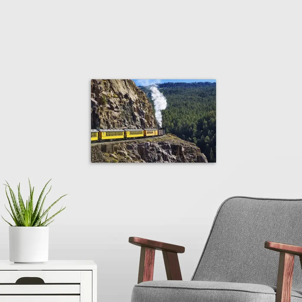 Historic steam engine train travels from Durango to Silverton through the San Juan Mountains in Colorado, USA.