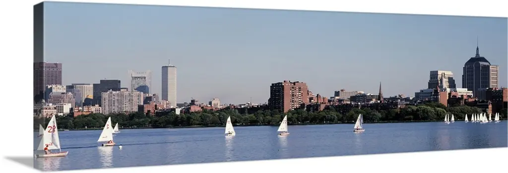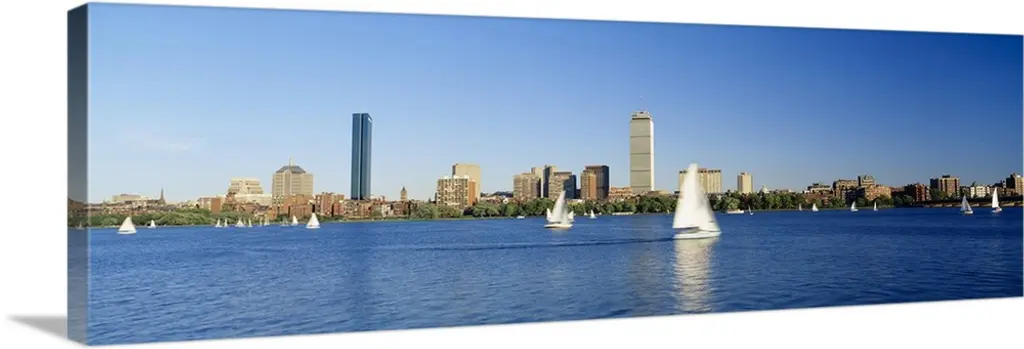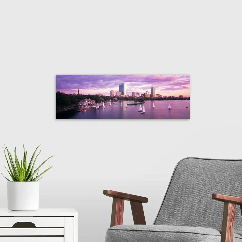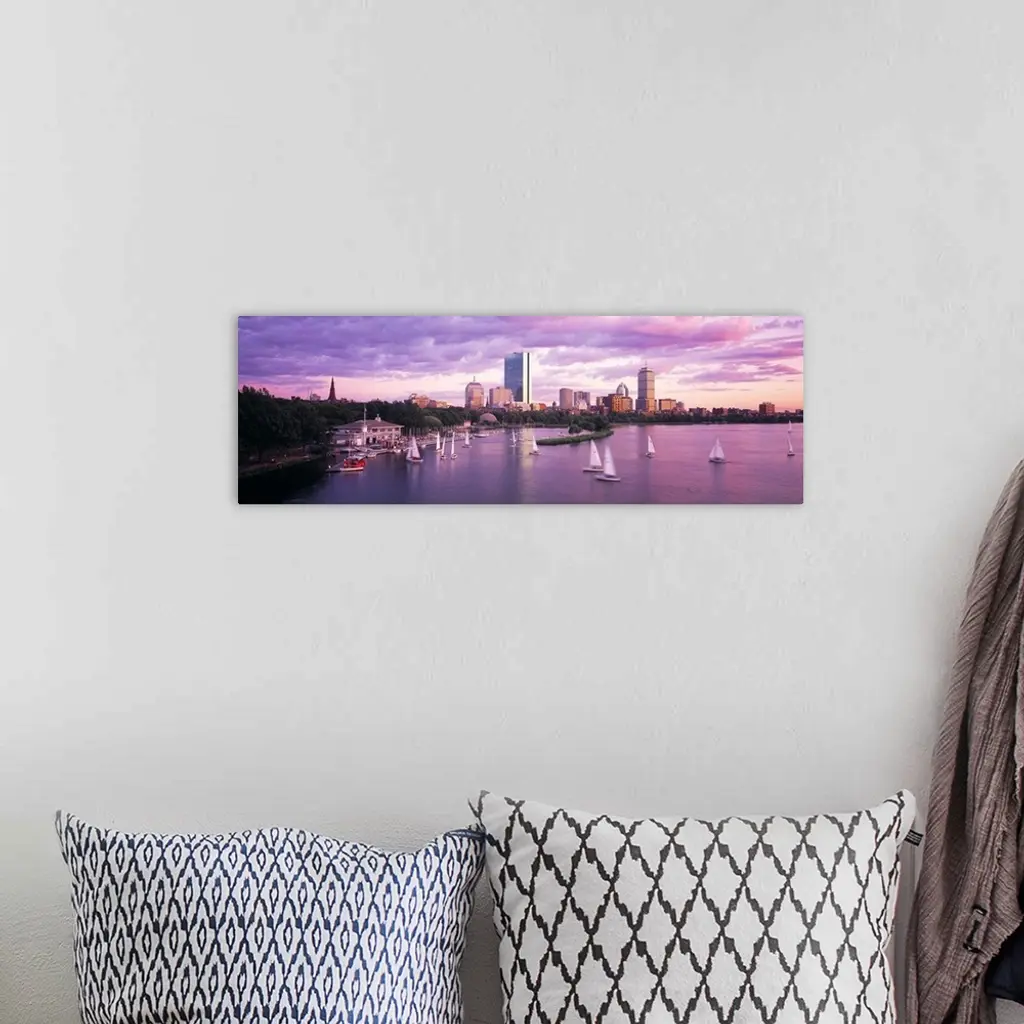 Panoramic photograph of skyline and waterfront at sunset. There are sailboats in the water under a cloudy sky.