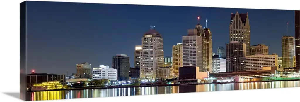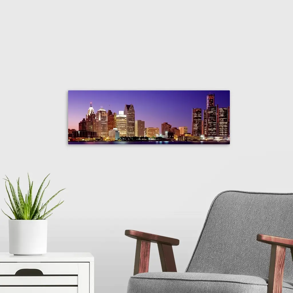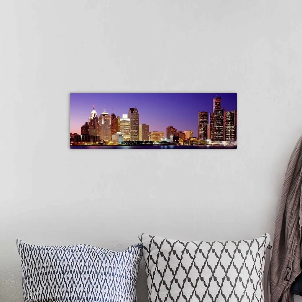 A panoramic cityscape at dusk with lights illuminated the buildings and water.