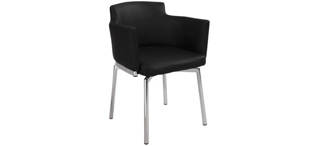 The Dusty swivel dining chair is a fun addition to your dining room. This chair features a memory swivel and black upholstery. Club style and chrome finished legs make for a great addition to your contemporary dining space.