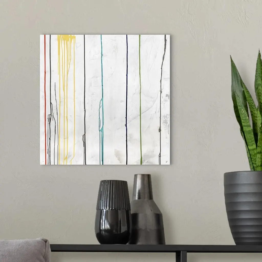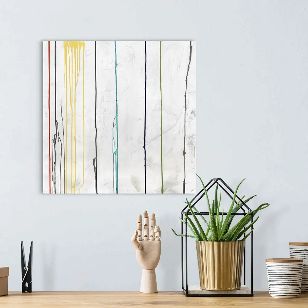 Square abstract art with dripping lines of color in green, orange, yellow, dark blue, light blue, and gray on a white background with some gray to create depth.