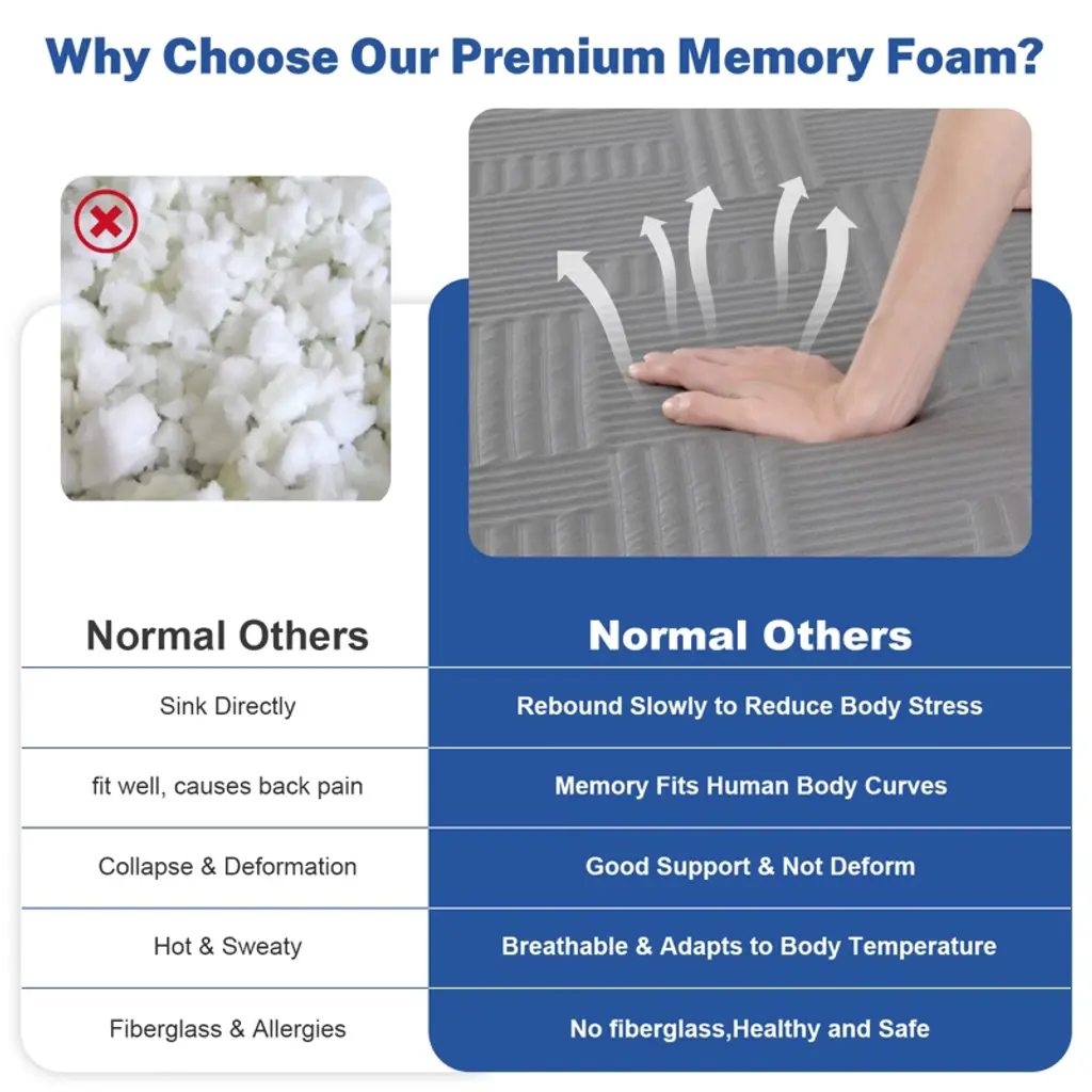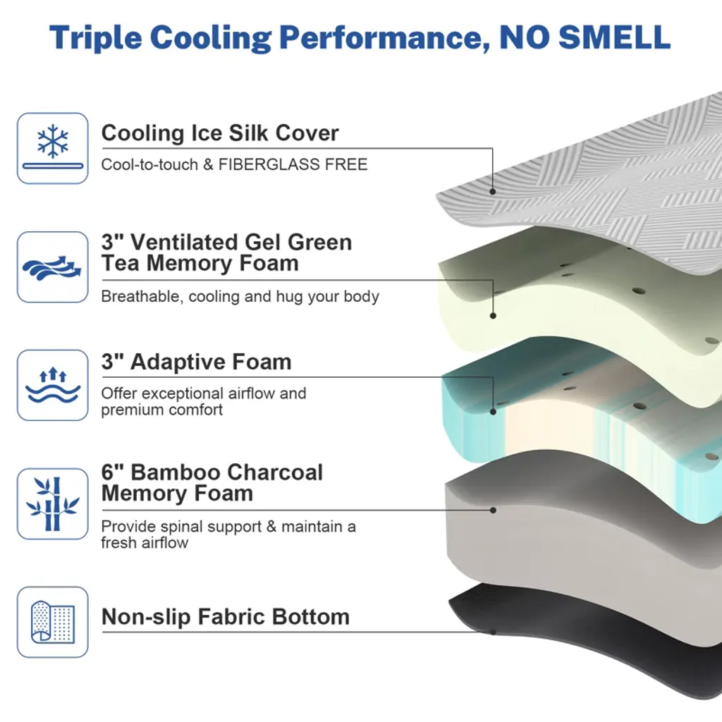 The Ultra Cooling Green Tea Mattress is here to help you improve your sleep quality. Designed with a 5-layer cooling system, it consists of cool-to-touch ice silk cover+ 3" green tea memory foam + 2" liquid gel coolflex foam + bamboo charcoal foam to brings you a better sleep. Just enjoy cool sleep all night and embrace a refreshed morning! You deserve a quality deep sleep. The slow rebound memory foam will conform to the body shape perfectly, relieve pain at pressure points, generate enough pushback to provide excellent support to every inch of your body. Say Goodbye to back and spine pain. Equipped with a high-quality zipper at the bottom of the mattress for easy removal of the cover. You can simply toss it into the washing machine for a quick and easy clean. It has a stylish grey color cover, not easy to get dirty, friendly for children and pets.