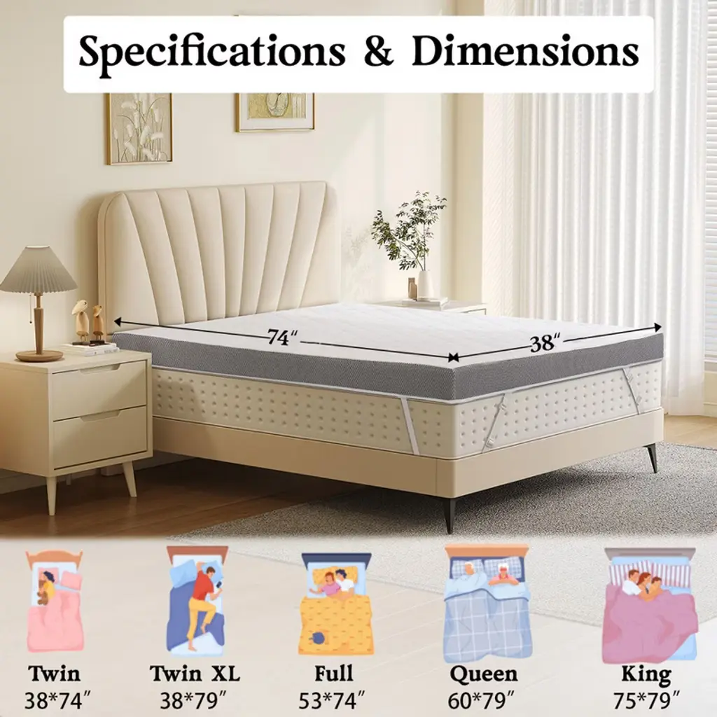Experience the ultimate solution for back and waist pain with our Extra Firm Mattress Topper,specifically engineered to provide superior spinal support while maintaining ideal comfort.Crafted with high-density, bamboo charcoal-infused foam, this 3-inch topper delivers a deformation-resistant surface that stays fresh and odor-free¡ªall certified by CertiPUR-US and Oeko-Tex Standard 100 for health and safety.The removable, skin-friendly cover features non-slip beads and adjustable straps to keep the topper securely in place, and is easily machine-washable for hassle-free maintenance.Perfect for revitalizing your existing mattress in bedrooms, guest rooms, dorms,or RVs, this topper offers an affordable upgrade for deeper, more supportive sleep.Should you have any questions, our customer support team is always ready to assist.