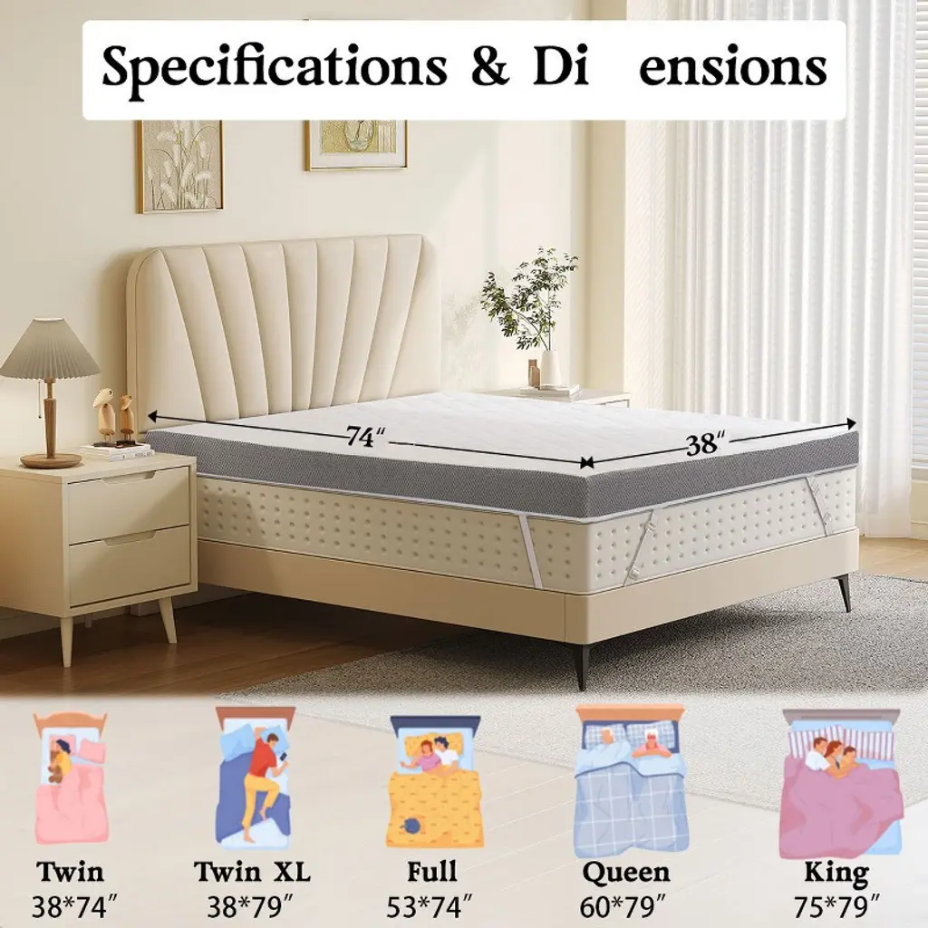 This bed topper is specially designed as an extra firm level.It's highly suitable for people who suffer from back pain/waist pain caused by insufficient spinal support.If you are looking for an extra firm bed topper that perfectly balances comfort and support, this would be the right one for you! The 3 inch foam mattress topper is made of bamboo charcoal infused foam, which is supportive, does not deform, and gives you the "just right" firm. Bamboo charcoal foam efficiently maintains a fresh environment, with no smell, and makes you sleep more comfortably.The foam mattress topper with a breathable and removable cover,is skin-friendly and soft to the touch,allowing you to enjoy a refreshing night's sleep.Non-slip beads and adjustable elastic straps on the cover back ensure a secure fit.Zipper closure for convenient disassembly and washing.