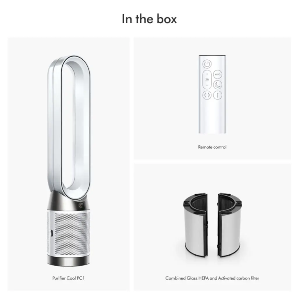 The Dyson Purifier Cool PC1 delivers whole-room purification* and powerful cooling.** The fully sealed filter system captures 99.97% of microscopic allergens† and pollutants as small as 0.3 microns.†† The whole purifier, not just the filtration system, is fully sealed to HEPA H13 grade¶ so what goes inside, stays inside. Air Multiplier technology projects over 76 gallons per second of smooth-yet-powerful airflow.¶¶ Connect to the MyDyson app to control and monitor air quality from anywhere, or go hands-free with compatible voice services.§