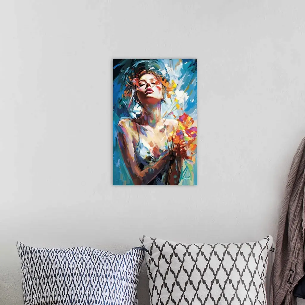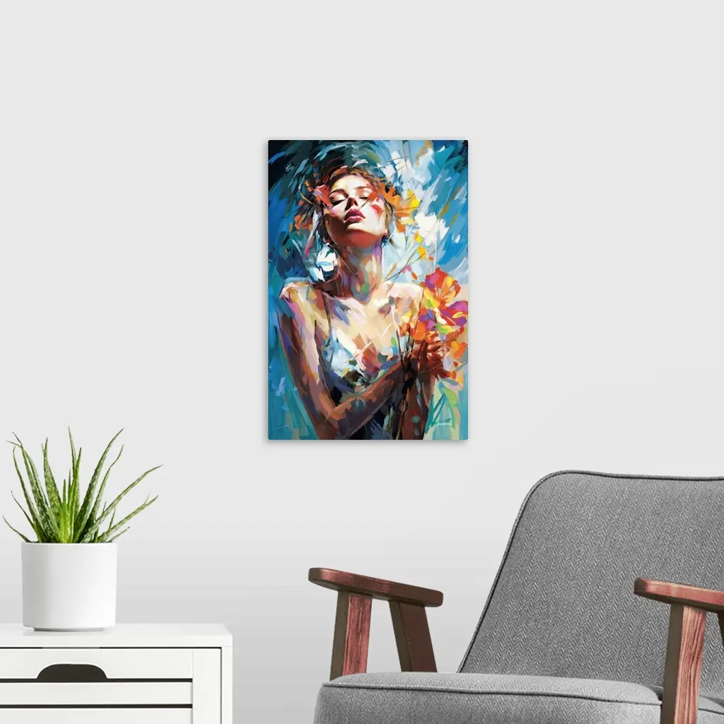 Abstract portrait of a woman with eyes closed, embracing vibrant flowers as bold brushstrokes of color swirl around her.