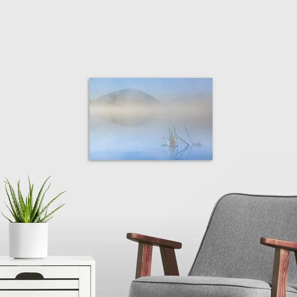 Dense fog obscuring the mountains at the edge of Eagle Lake in Acadia National Park, Maine.
