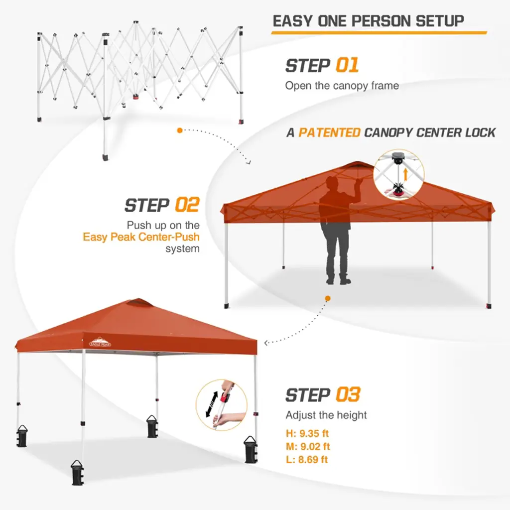 This easy setup pop up canopy tent features the Peak Push system, a patented canopy center lock. The portable canopy requires no tools and easily opens and closes from the center in seconds. Its unique canopy tent center lock enables a quick, one person setup, letting you maximize outdoor time with minimal effort. With three adjustable height settings and a soft, button-free design, this tent is super convenient and safe to use. Whether you're camping, hitting the beach, selling crafts, tailgating, visiting farmers' markets, or having an outdoor barbecue, it's a great option for all kinds of outdoor activities.